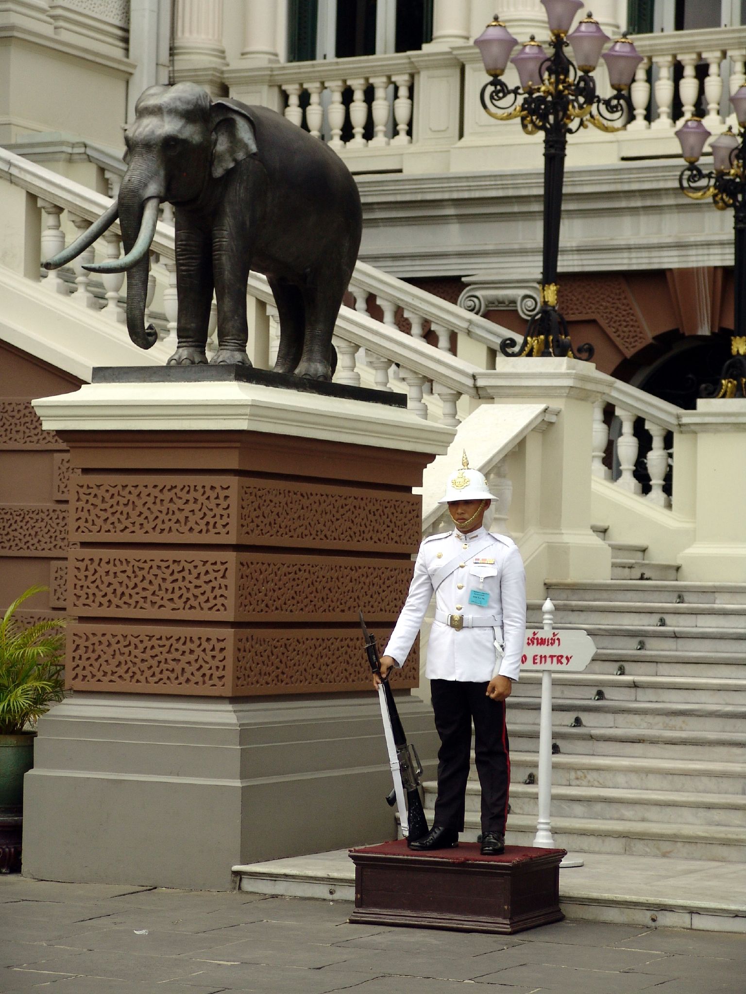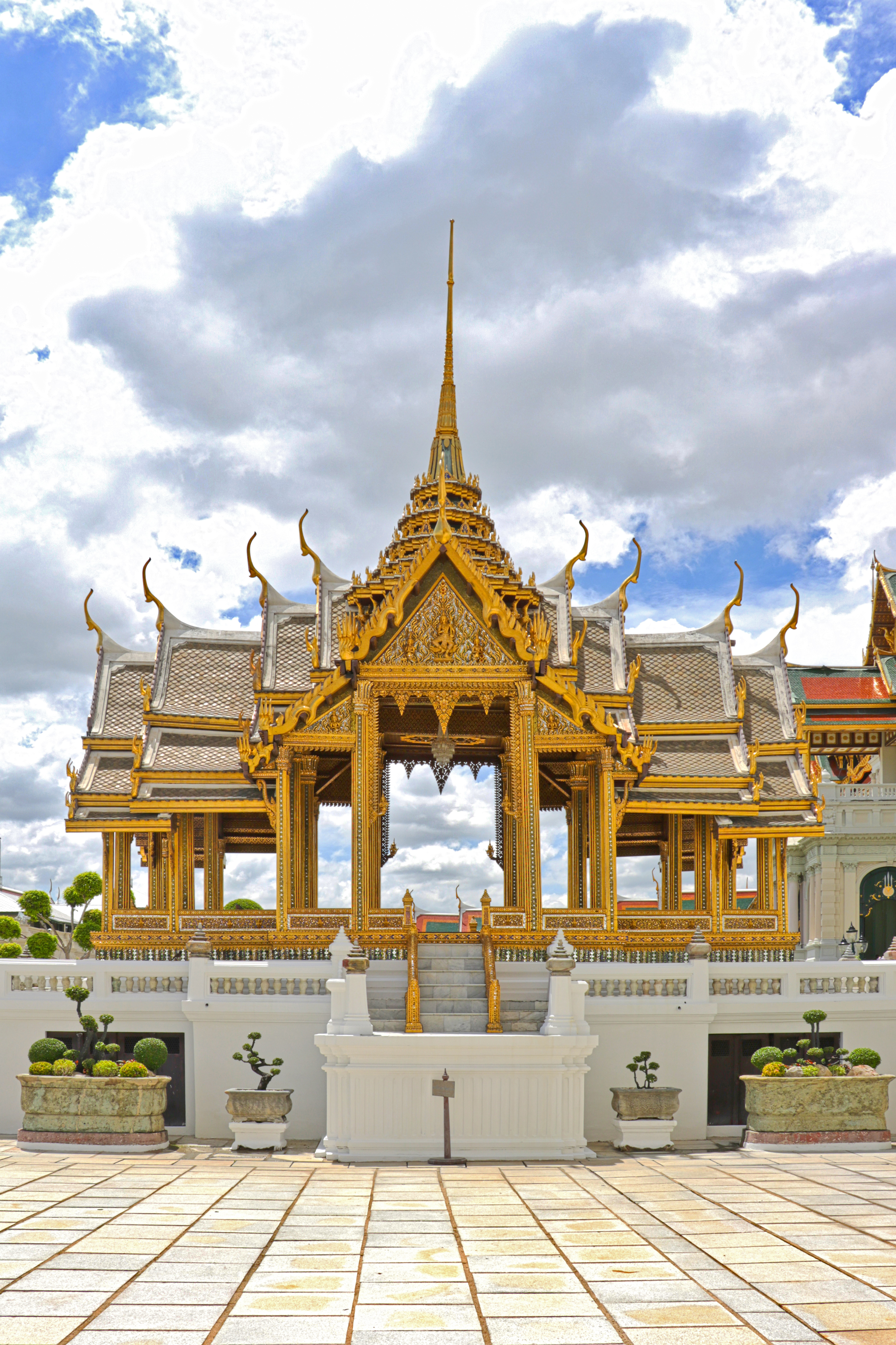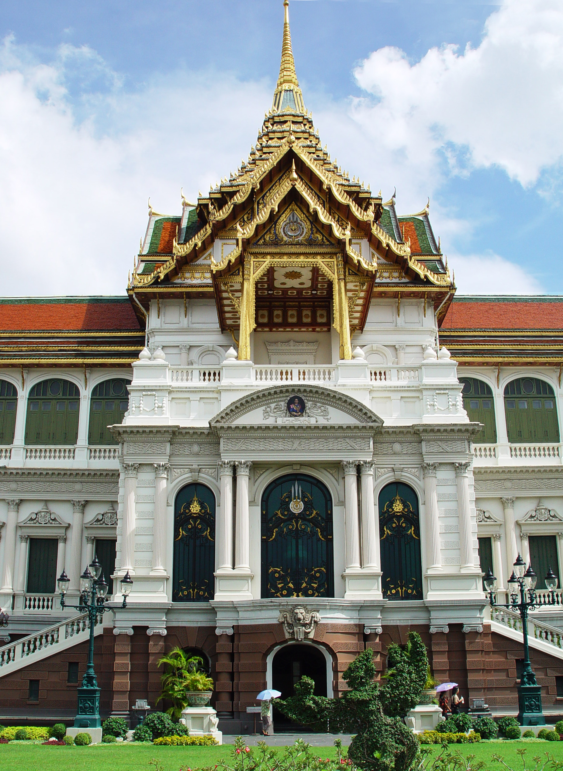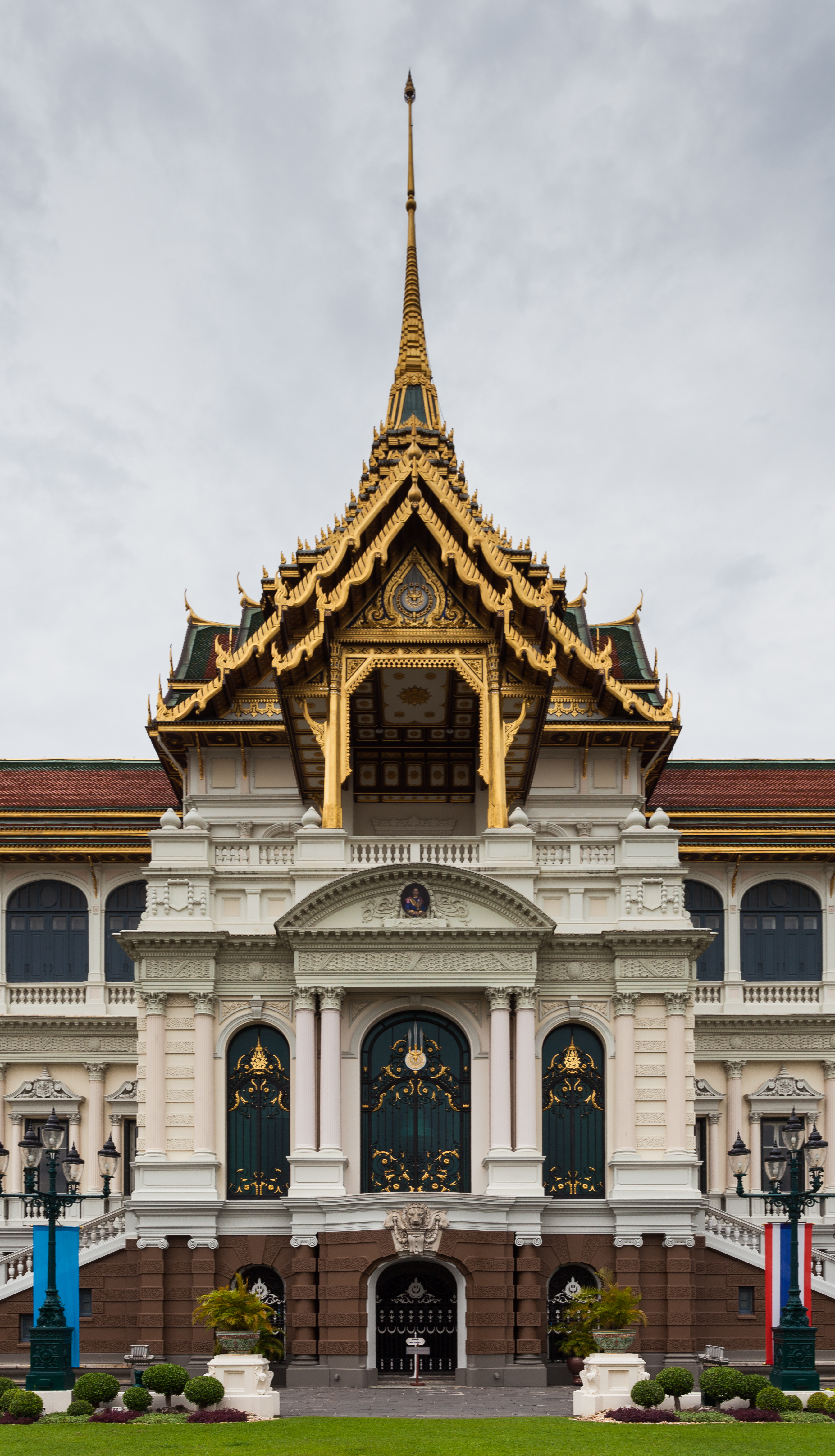 박공에는 가루다를 타고 있는 힌두교 신인 나라야나의 모습이 장식되어 있다. 이것은 왕을 나라야나와 연관시키고 그의 권위를 더욱 나타낸다. 전설에 따르면, 나라야나는 인간의 고통을 덜어주기 위해 인간의 형태로 천국에서 내려왔다. 그는 이상적인 왕의 모든 자질을 대표한다. 옥좌는 볼록하고 오목한 몰딩이 있는 높은 기단 위에 서 있다. 태국 신앙에 따르면, 가장 아래층은 사자의 발을 닮았는데, 사자는 부처의 가족을 상징하며 부처 자신의 왕족 유산을 암시한다.[78][86]