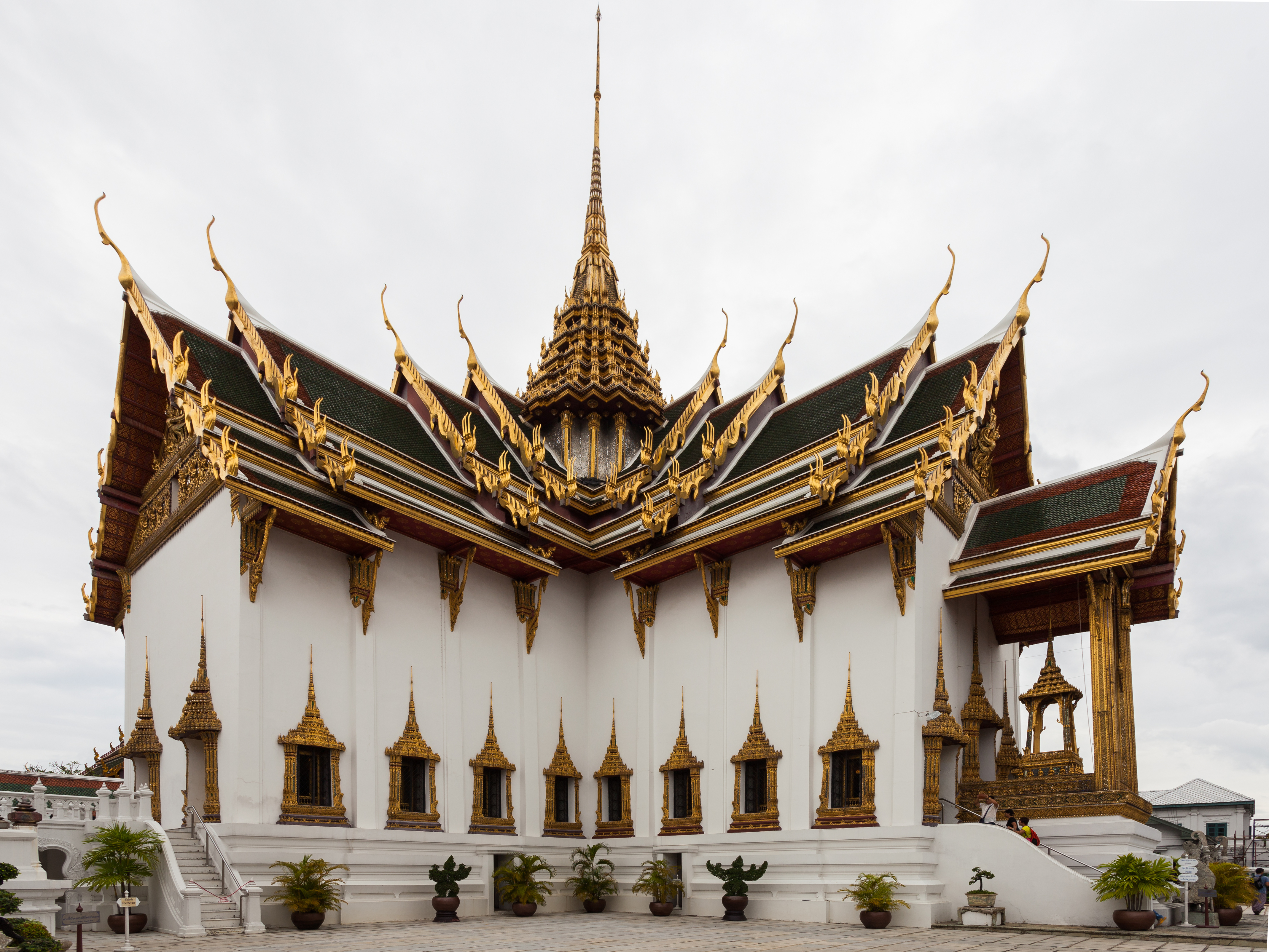 넓은 왕좌홀은 높이 50cm의 기단 위에 있으며, 지붕은 녹색과 주황색 기와로 덮여 있다. 박공에는 인드라 신을 묘사한 벽화로 장식되어 있다. 홀 안에는 두 줄로 된 사각형 기둥들이 있으며, 태국 꽃무늬 디자인으로 장식되어 있다. 천장에는 유리 모자이크 별로 장식되어 있다.[33][34]