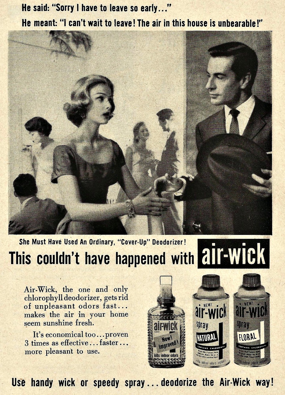 1939년 에어윅(Air Wick)은 증발을 통해 작동하는 다양한 향의 액체 방향제를 미국에 출시했다.[3] 엽록소를 사용해 냄새를 제거한다고 주장했지만, 1953년부터 엽록소의 탈취 효과에 대한 의문이 제기되었다.[4][5][6] 1947년부터 1951년까지 에어윅 및 기타 유형의 공기 청정제는 700만달러 어치가 판매되었다.[6]
