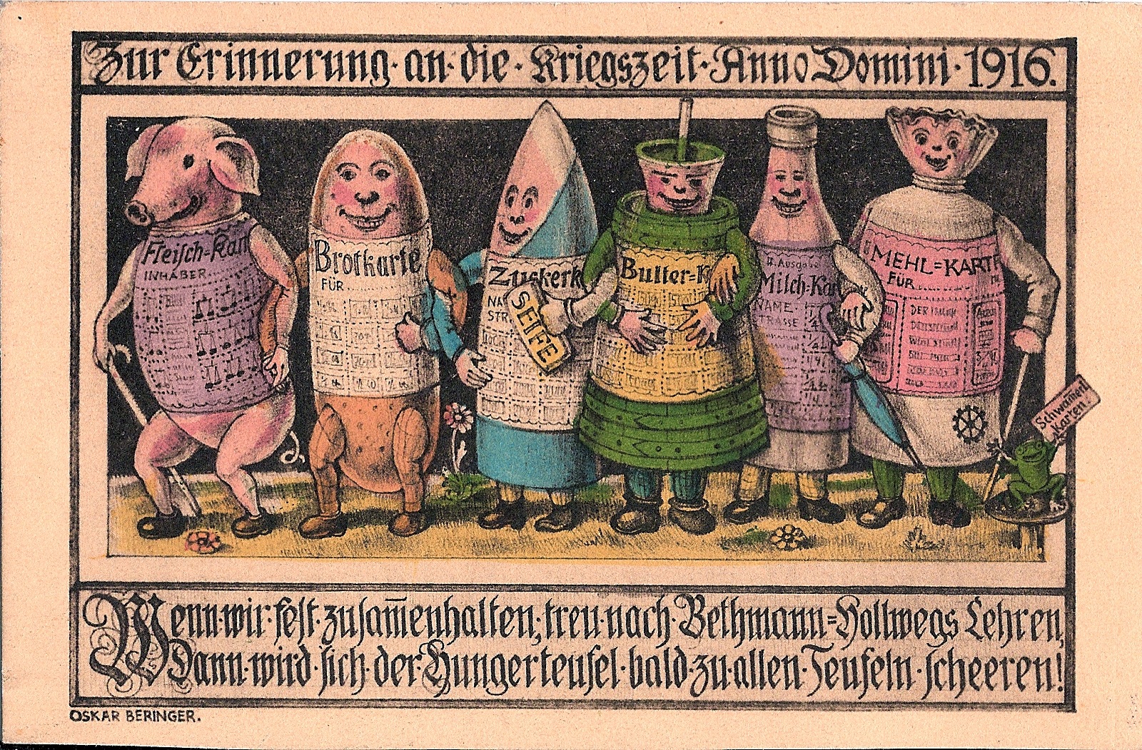 배급을 돕기 위해 1918년부터 버터, 마가린, 라드, 고기, 설탕에 대한 배급표가 도입되었다. 전쟁 중 평균 칼로리 섭취량은 3% 감소했지만 단백질 섭취량은 6% 감소했다.[11]