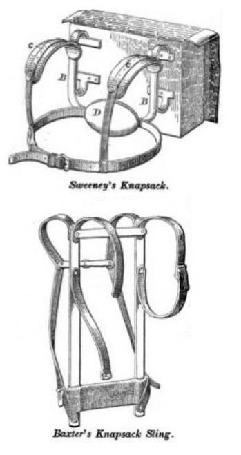 최초의 특허받은 외부 프레임 배낭은 19세기 후반 미국의 육군 장교 헨리 클레이 메리엄이 만들었다. 1887년에 소개된 메리엄의 배낭은 칙칙한 오리 캔버스로 만들어졌으며 가벼운 강철 프레임에 부착되었다. 보병이 침낭과 물통을 가슴과 엉덩이에 올려놓는 대신 프레임에 부착할 수 있도록 여러 개의 가죽 끈이 있었다. 특히 허리띠의 가죽 주머니까지 뻗어 있는 두 개의 경목 막대 덕분에 팩을 등과 어깨에서 들어 올려 하중의 무게를 엉덩이로 전달할 수 있었다. 메리엄은 자신의 발명품을 미 육군에 판매하려 했으나 실패했고, 뉴욕 주 방위군, 프랑스군, 오스트리아군에 수천 개의 팩을 판매했다.[9]