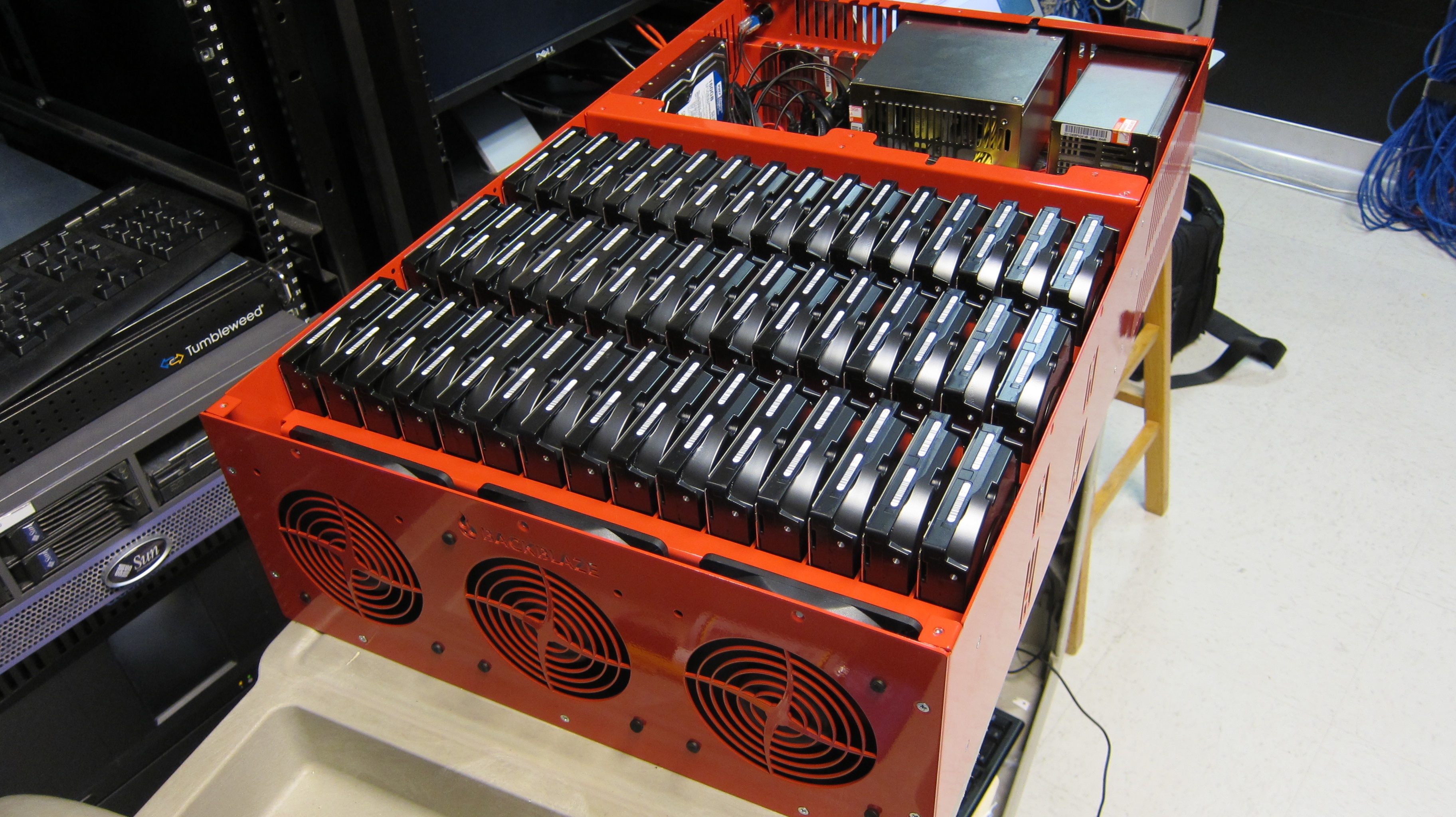 2009년과 2011년에 백블레이즈는 데이터센터의 스토리지 서버가 사용하는 컴퓨터 케이스의 CAD 도면을 공개하였다. x64 프로세서, 디스크, 메인보드, 고집약 스토리지 서버와 같은 상용 기성품 부품들은 상용 제품보다 더 낮은 가격으로 제조가 가능하다.[25]