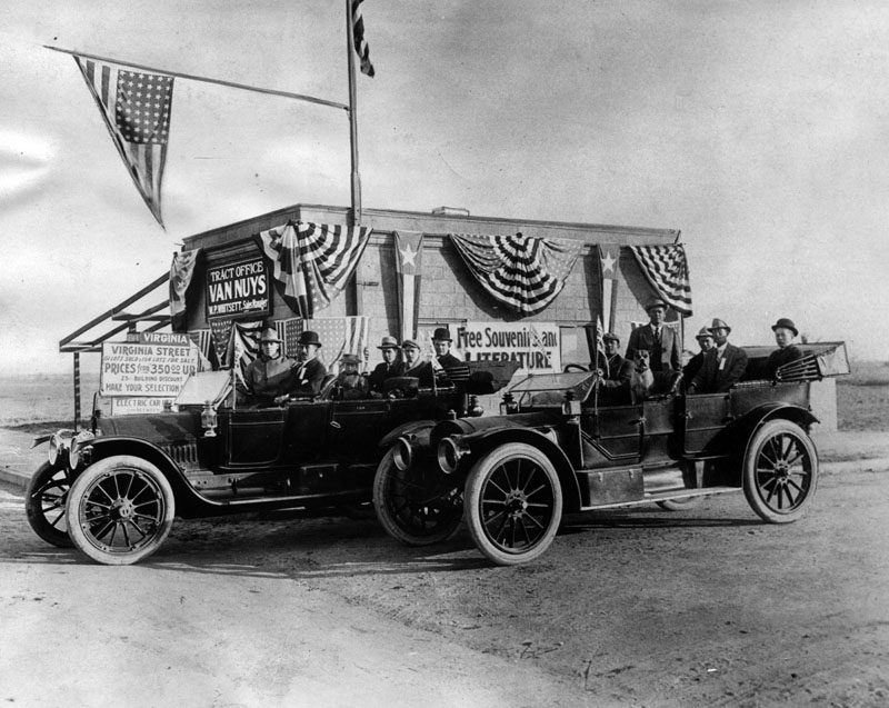 1909년, 호바트 존스톤 휘틀리가 이끄는 부동산 개발 신디케이트는 2500000USD에 샌 페르난도 밸리 남부 지역 48,000에이커를 매입했다.[1] 이 신디케이트에는 해리 챈들러, H. G. 오티스, M. H. 셔먼, O. F. 브랜트 등이 참여했다. 헨리 E. 헌팅턴은 이 지역을 통해 오웬스머스(현재 캐노가 파크)까지 퍼시픽 일렉트릭 철도(레드 카)를 확장했다. 개발 회사들은 도로와 밴나이즈, 리시다(Marian), 캐노가 파크(오웬스머스) 마을을 건설했다.[2][3]1911년, 아이작 뉴턴 반 누이스의 이름을 따서 밴나이즈 마을이 공식적으로 설립되었다.[4][5] 1915년 5월 22일, 로스앤젤레스 수도교가 완공되면서 밴나이즈는 로스앤젤레스시에 합병되어 안정적인 물 공급을 받게 되었다.[6][7] 퍼시픽 일렉트릭 철도 밴나이즈선은 초기 토지 판매와 상업 발전에 큰 영향을 미쳤다.[5] 1917년에는 알함브라에서 5에이커 농장의 잠재 구매자를 위한 당일 여행이 조직되기도 했다.[8]