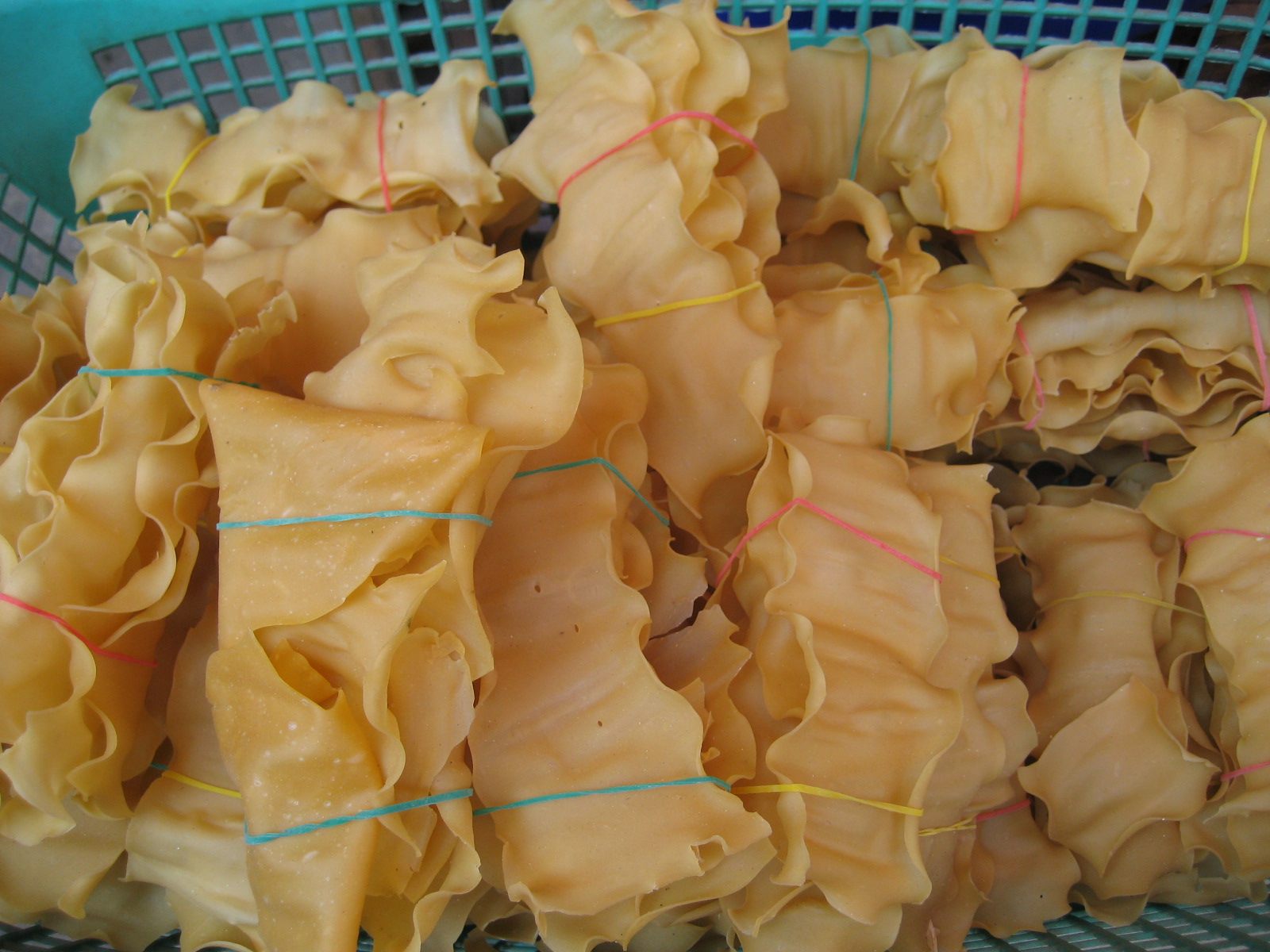(တိုဖူးခြောက်း )는 노란색 두부를 길고 얇은 직사각형 형태로 썰어 햇볕에 말린 것이다. 새우 과자나 생선 과자와 유사하며 묶음으로 판매된다.