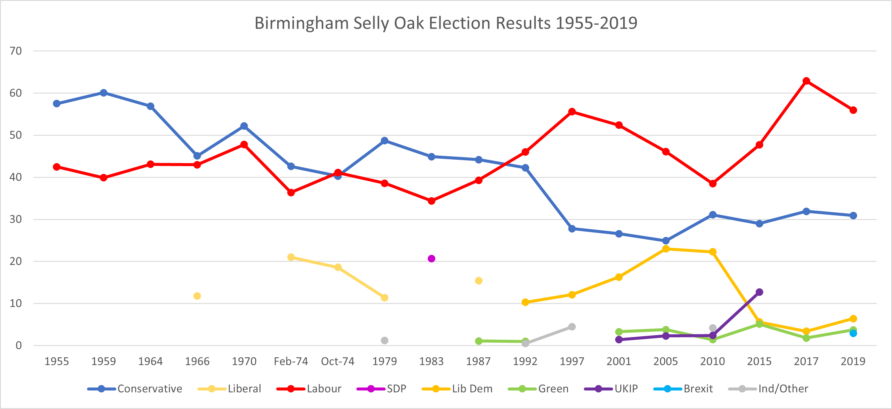 버밍엄셀리오크 선거구에서는 1955년부터 현재까지 총선이 치러졌다. 각 연도별 선거 결과는 하위 문단을 참고하면 된다.