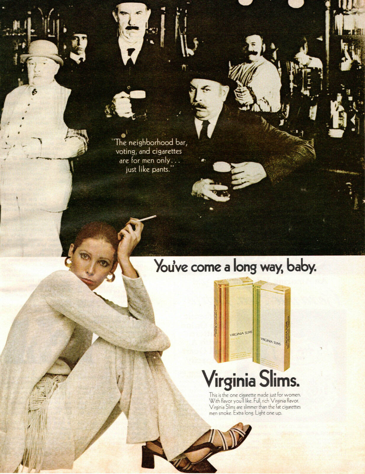 1960년대와 1970년대에는 페미니즘과 여성 해방의 테마가 "당신은 정말 멀리 왔어요, 베이비"라는 슬로건과 함께 버지니아 슬림 광고에 자주 사용되었다. 이러한 광고는 종종 20세기 초에 흡연으로 처벌받았던 여성들에 대한 일화를 보여주었는데, 주로 남편이나 다른 남성에 의해 처벌받았으며, 오늘날 여성들이 투표권과 같은 평등한 권리를 갖게 된 것과 비교되었다.[10][2][11][12][13] 이후 캠페인에서는 1990년대에 "이건 여자만의 일이야"라는 슬로건과 2000년대에 "당신의 목소리를 찾으세요"라는 슬로건을 사용했다.[14]