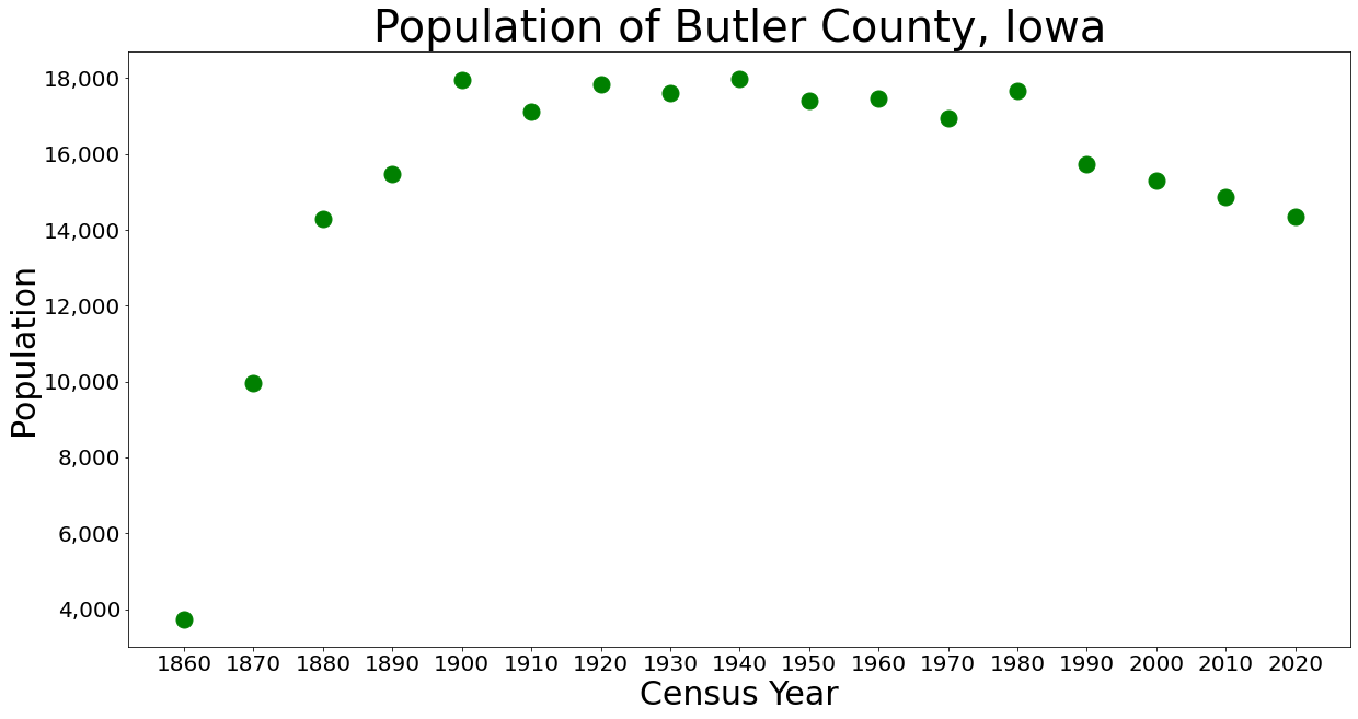 2020년 미국 인구 조사에 따르면 버틀러군의 인구는 14,334명이며, 인구 밀도는 9.5명/km² (24.6명/mi²)이다.[1]