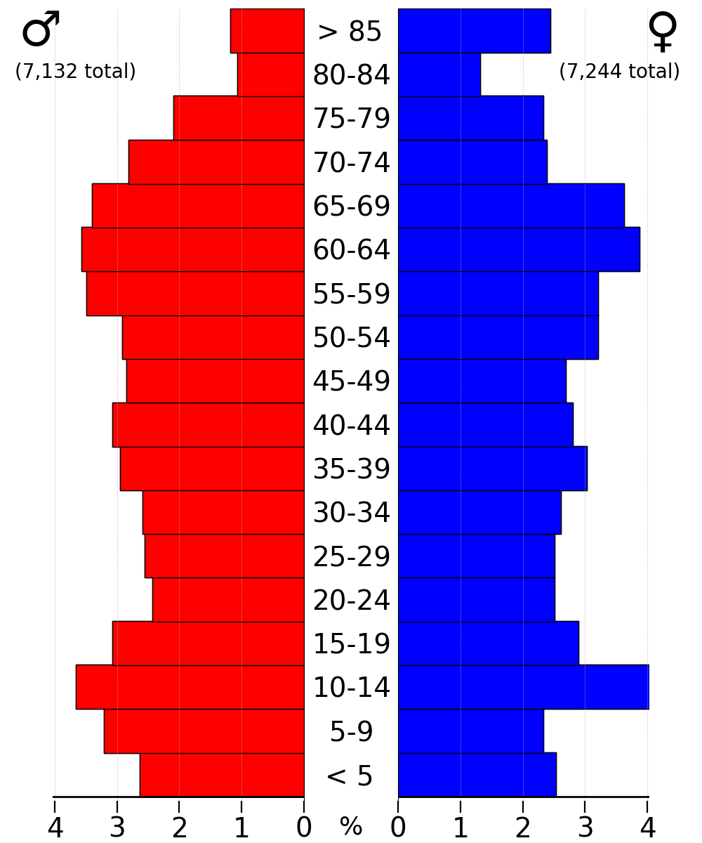 연령대별 인구 분포는 18세 미만 24.40%, 18~24세 6.40%, 25~44세 24.90%, 45~64세 24.20%, 65세 이상 20.10%였다. 평균 연령은 41세였다. 여성 100명당 남성은 96.20명이었고, 18세 이상 여성 100명당 남성은 93.70명이었다.