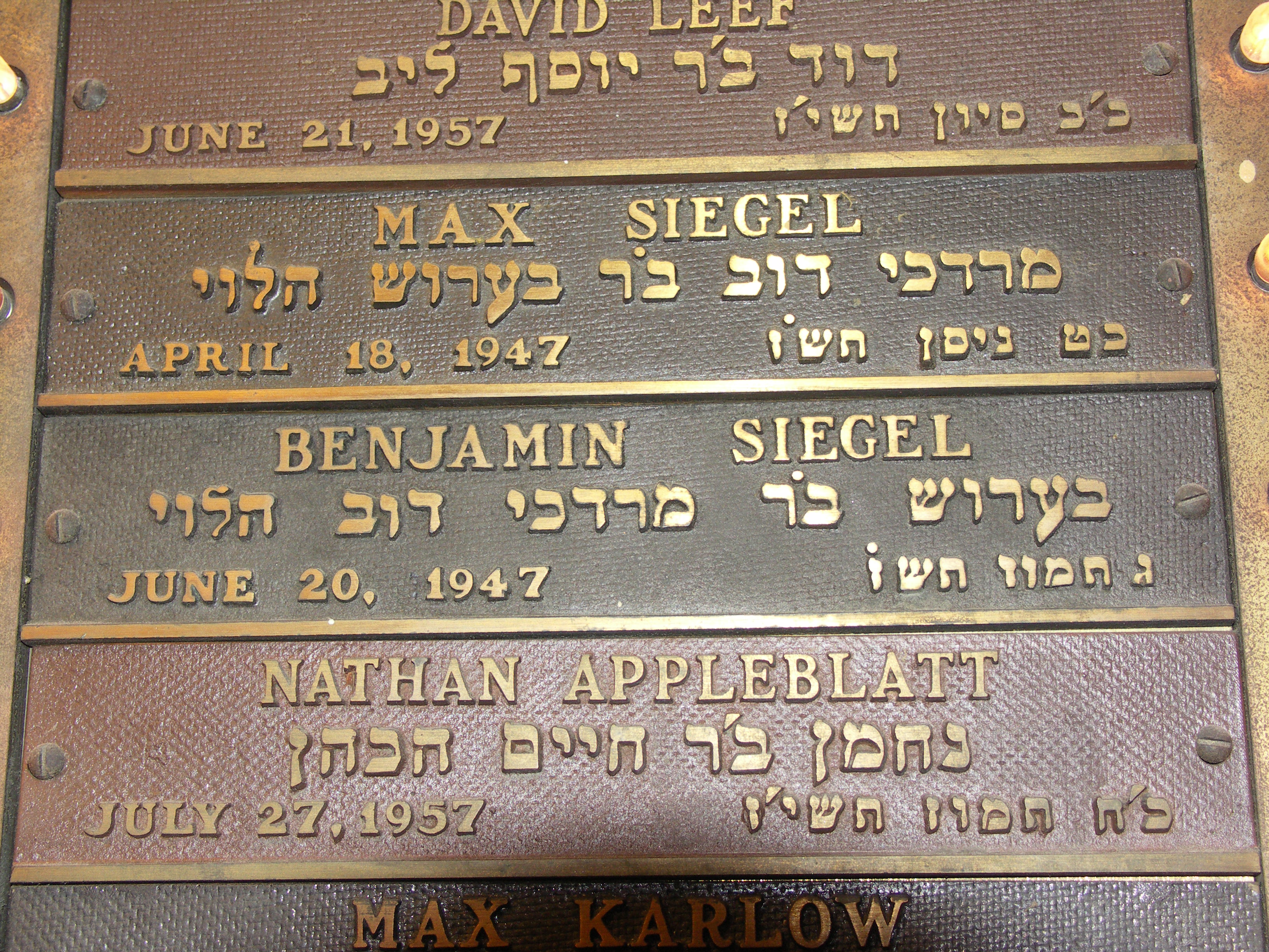 시걸은 뉴욕 로어 이스트 사이드의 비알리스토커 시나고그에서 그의 사망일을 기념하는 야흐르차이트 (추모) 현판에 의해 기념되며, 이를 통해 조문객들은 그 기념일에 카디쉬를 읊을 수 있다. 시걸의 현판은 그의 아버지인 맥스 시걸의 현판 아래에 있는데, 맥스 시걸은 아들보다 불과 두 달 전에 사망했다. 플라밍고 라스베이거스 부지 내, 수영장과 웨딩 채플 사이에 시걸을 기리는 기념 현판이 있다.[60] 시걸의 유해는 할리우드 포에버 묘지에 매장되었다.