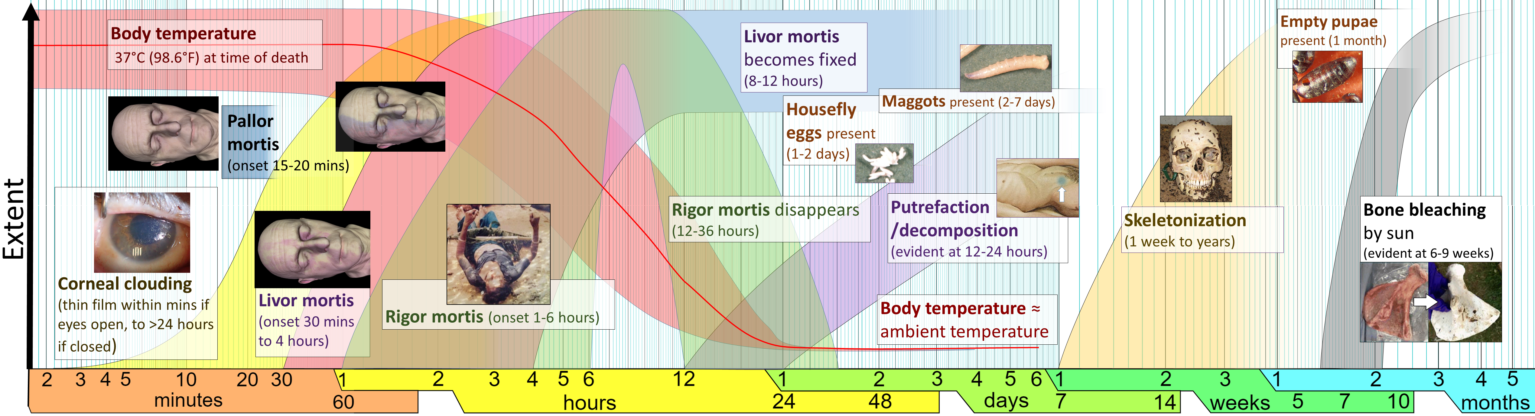파리는 부패하는 시체에서 방출되는 휘발성 유기 화합물(VOC)에 이끌려 범죄 현장에 자주 나타난다.[25] 시체는 파리가 알을 낳기에 완벽한 환경을 제공하며, 발달하는 구더기는 먹이를 쉽게 얻을 수 있다. 시체에서는 여러 종류의 파리가 발견되는데, 그중 가장 중요한 것은 검정파리과이다.검정파리과(Calliphoridae)에 속하는 파리는 금속성 외관을 가지며 길이는 10~14mm이다.[26] 검정파리라는 이름 외에도 파란병파리, 군집파리, 녹색병파리, 검은 검정파리 등으로도 불린다. 검정파리는 3분절된 촉수를 가진 것이 특징이다. 알에서 부화하여 첫 번째 유충 단계까지 8시간에서 1일이 걸린다. 유충은 세 단계를 거쳐 발달하며(이것을 령기라고 부름), 각 단계는 탈피로 구분된다.[27] 유충의 용화에 가장 이상적인 서식지는 느슨하고 습한 토양과 낙엽을 이용할 수 있는 곳이며, 온대 및 열대 지역에 주로 분포한다.[28] 전 세계적으로 1100종의 검정파리가 알려져 있으며, 신열대구에 228종, 아프리카와 남부 유럽에 많은 종이 있다. 검정파리과 종을 발견할 수 있는 가장 일반적인 지역은 인도, 일본, 중앙 아메리카 및 미국 남부이다.