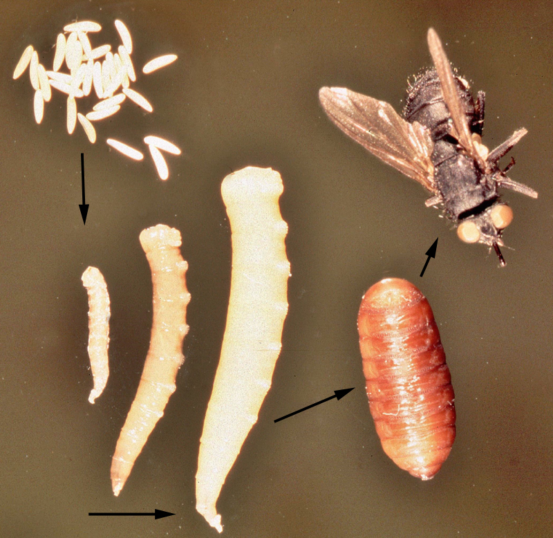 집파리과 | (Muscidae) | 가장 흔한 파리. 질병을 옮기는 해충. 6mm~9mm. 회색 가슴에 4개 어두운 세로선. 노란색 배 아랫면. 털로 덮임. 암컷은 최대 500개 산란. Hydrotaea 속이 중요. |