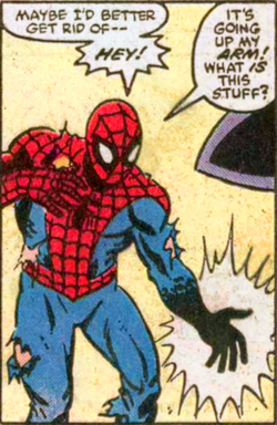 하지만, 코스튬은 피터 파커가 잠자는 동안 그를 덮고 밤에 나가 범죄와 싸우며 파커를 지치게 했다.[2][19] 리드 리처드는 코스튬이 살아있는 외계 생명체, 즉 심비오트임을 발견했고, 스파이더맨은 심비오트가 영구적으로 결합하려 한다는 것을 깨닫고 리드 리처드의 도움으로 심비오트를 분리하는 데 성공했다.[2][19] 톰 데팔코와 론 프렌즈는 코스튬이 불과 고음파 에너지에 취약하다는 설정을 추가했다.[13] 심비오트는 탈출하여[20] 다시 피터 파커와 결합했지만, 파커는 성당 종소리의 음파를 사용하여 심비오트를 물리쳤다.[3] 그러나 심비오트는 피터에게 정서적 애착을 갖게 되었고, 피터의 의식 불명 상태의 몸을 떠나 안전한 곳으로 옮긴 후 사라졌다.