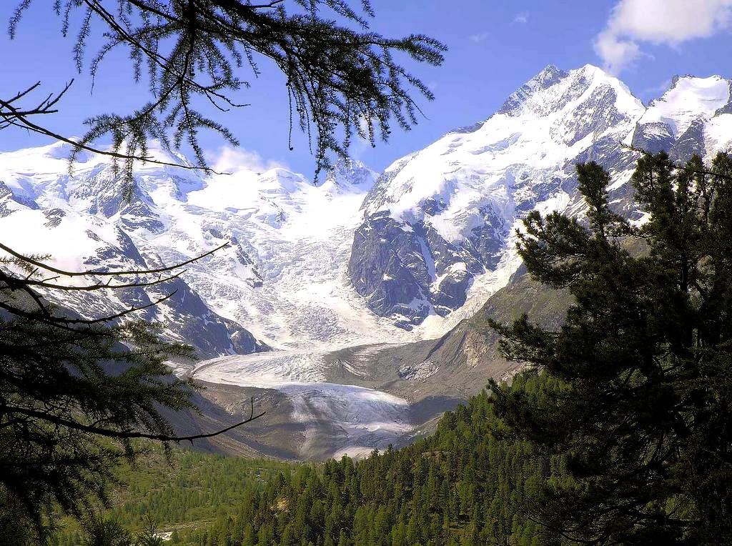 모르테라치 빙하 위의 소나무와 낙엽송 숲에서 본 모습