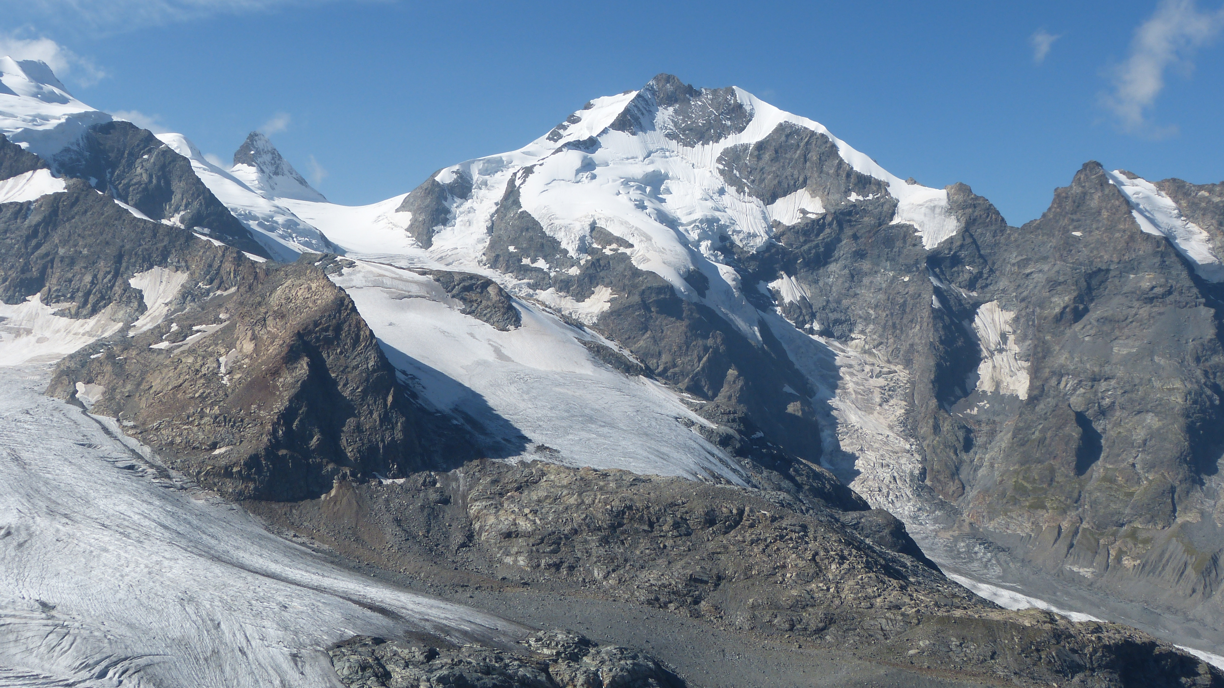 디아볼레차에서 본 파노라마. 왼쪽부터: 피츠 팔뤼, 벨라비스타, 크라스트 아구차 (중간의 작은 암석 봉우리), '''베르니나봉''', 피츠 모르테라치
