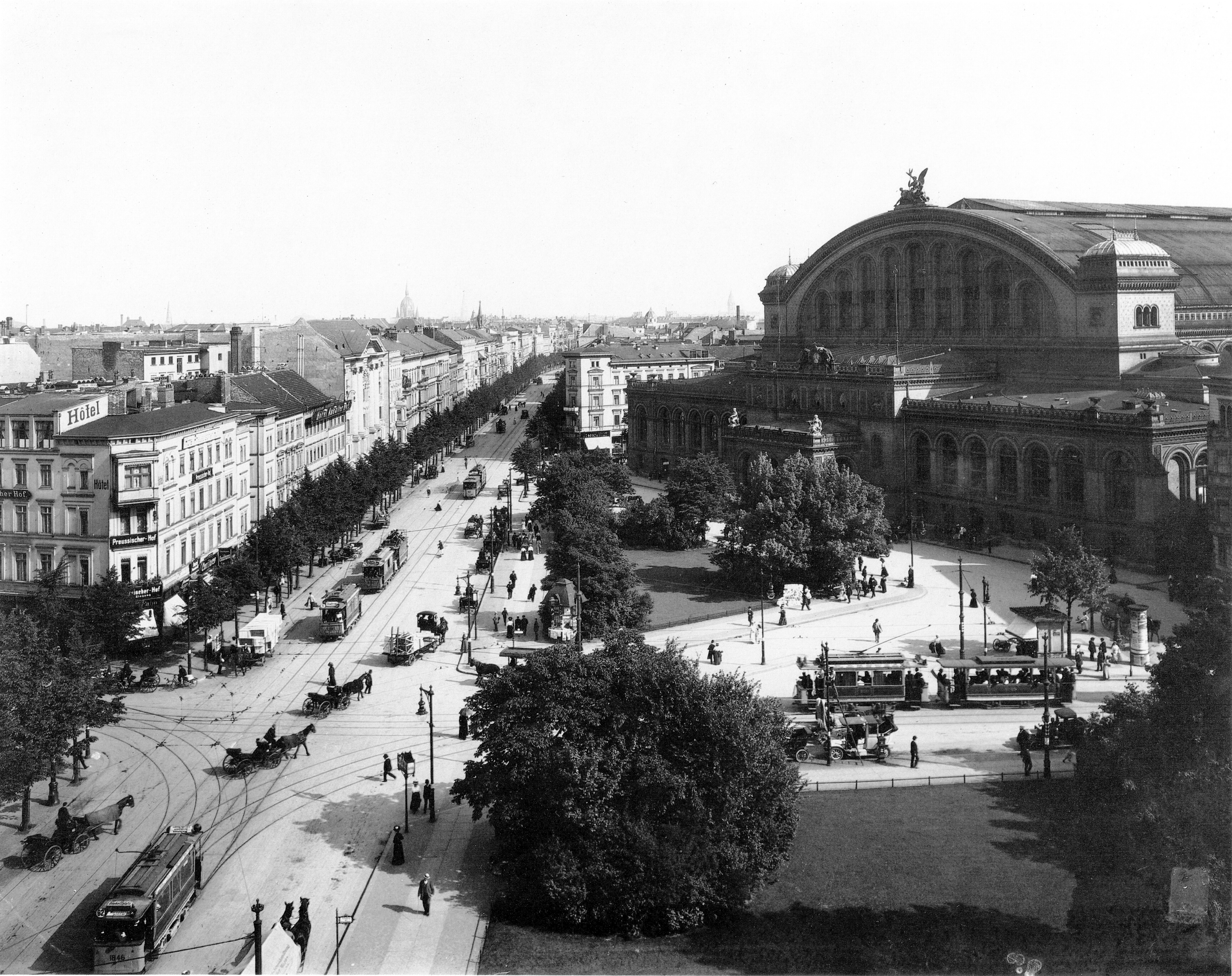 1900년의 모습으로, 당시 아스카니셔 광장과 쾨니히그래처 거리가 있는 두 번째 안할터역의 정면을 보여준다