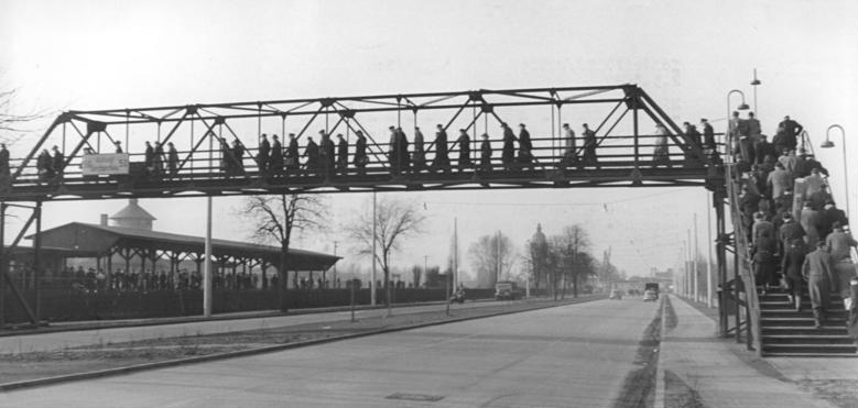 개통 당시에는 승강장 남동쪽에 있는 육교로 진입할 수 있었다. 이 육교는 도심 방향 S반선 위로 지나가서 아들러게슈텔 대로의 S반 기지 방향으로 연결되었으며, 일반인에게 개방되어 있었다. 반대쪽으로는 나머지 선로 위로 지나가서 장거리 열차 조차장으로 연결되었으며, 일반인에게 개방되지 않았다. 1983년부터 1986년까지 새로운 육교가 건설되었고, 구 육교는 1986년에 철거되었다.