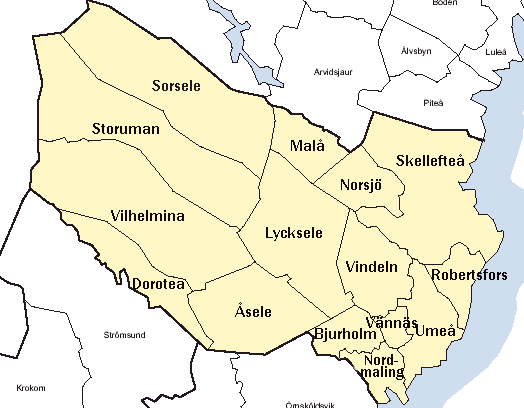 자치체 목록 | 오셀레 뷔르홀름 도로테아 릭셀레 말å 노르드말링 노르셰 로베르츠포르스 스켈레프테오 소르셀레 스토르우만 우메오 벤네스 빌헬미나 빈델른 |