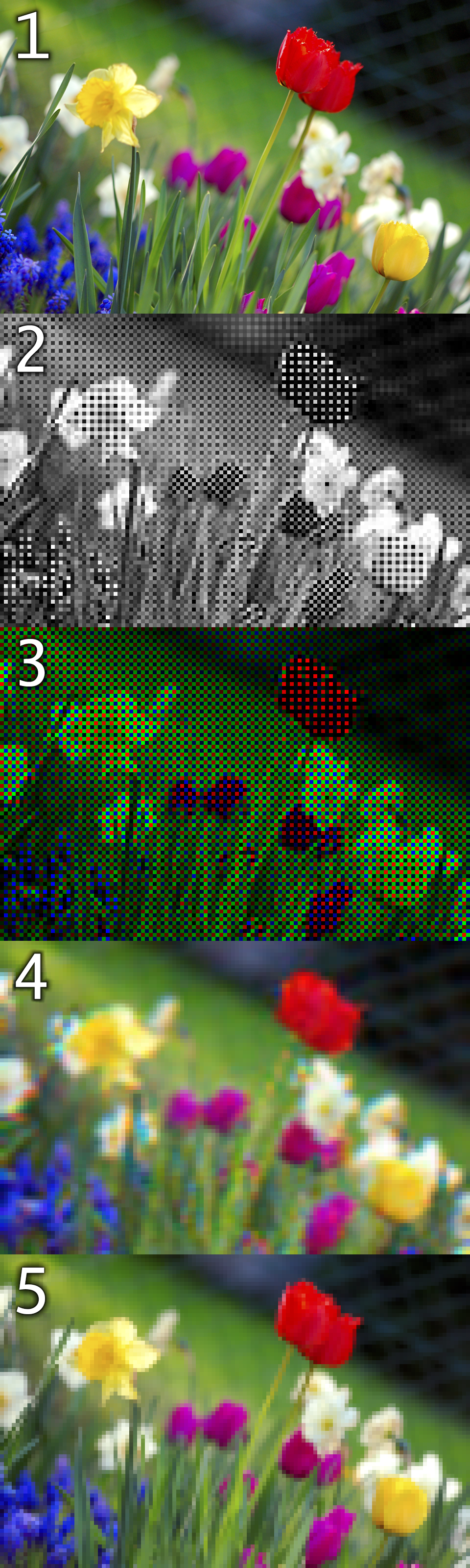 베이어 필터 카메라의 RAW 출력은 ''베이어 패턴'' 이미지라고 한다. 각 픽셀은 세 가지 색상 중 하나만 기록하도록 필터링되므로, 각 픽셀의 데이터는 자체적으로 적색, 녹색 및 청색 값을 모두 지정할 수 없다. 풀 컬러 이미지를 얻기 위해 다양한 디모자이킹 알고리즘을 사용하여 각 픽셀에 대한 완전한 적색, 녹색 및 청색 값 집합을 보간한다. 이러한 알고리즘은 특정 픽셀의 값을 추정하기 위해 해당 색상의 주변 픽셀을 사용한다.[6]