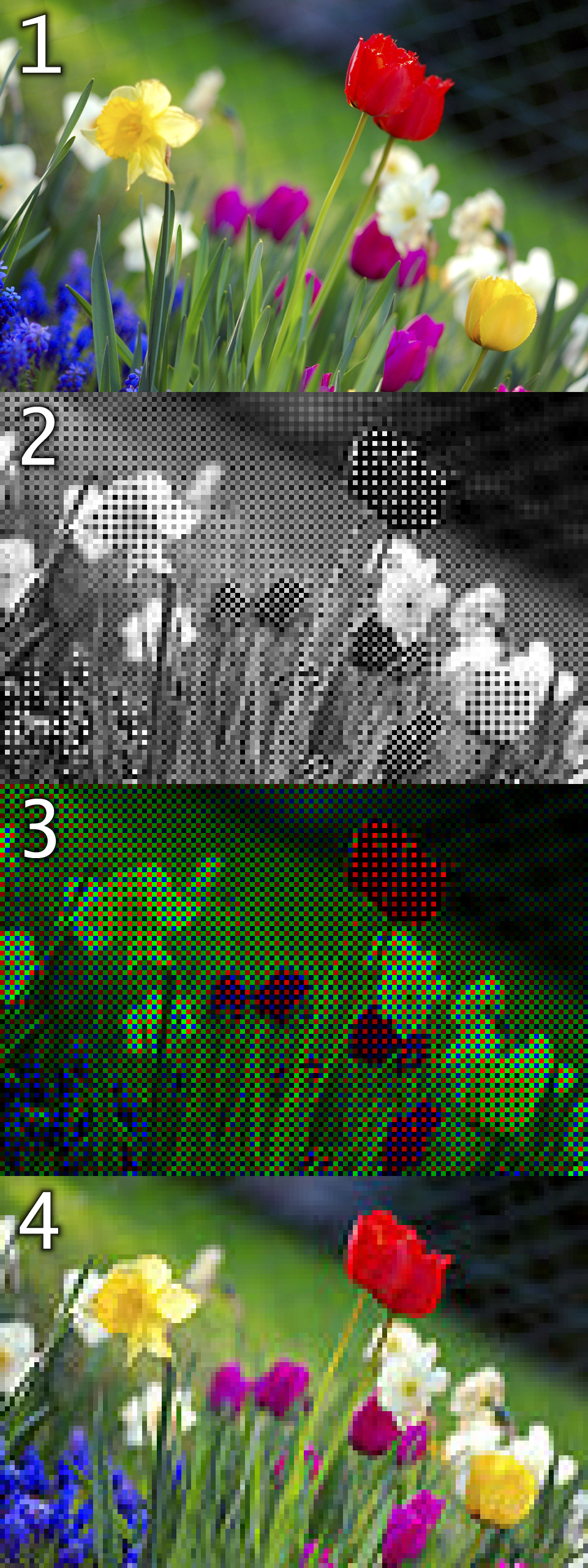 작동 원리 | 각 픽셀은 하나의 색상 정보만 기록하므로, 나머지 색상 정보는 주변 픽셀의 값을 이용하여 보간(demosaicing) 과정을 통해 추정 |