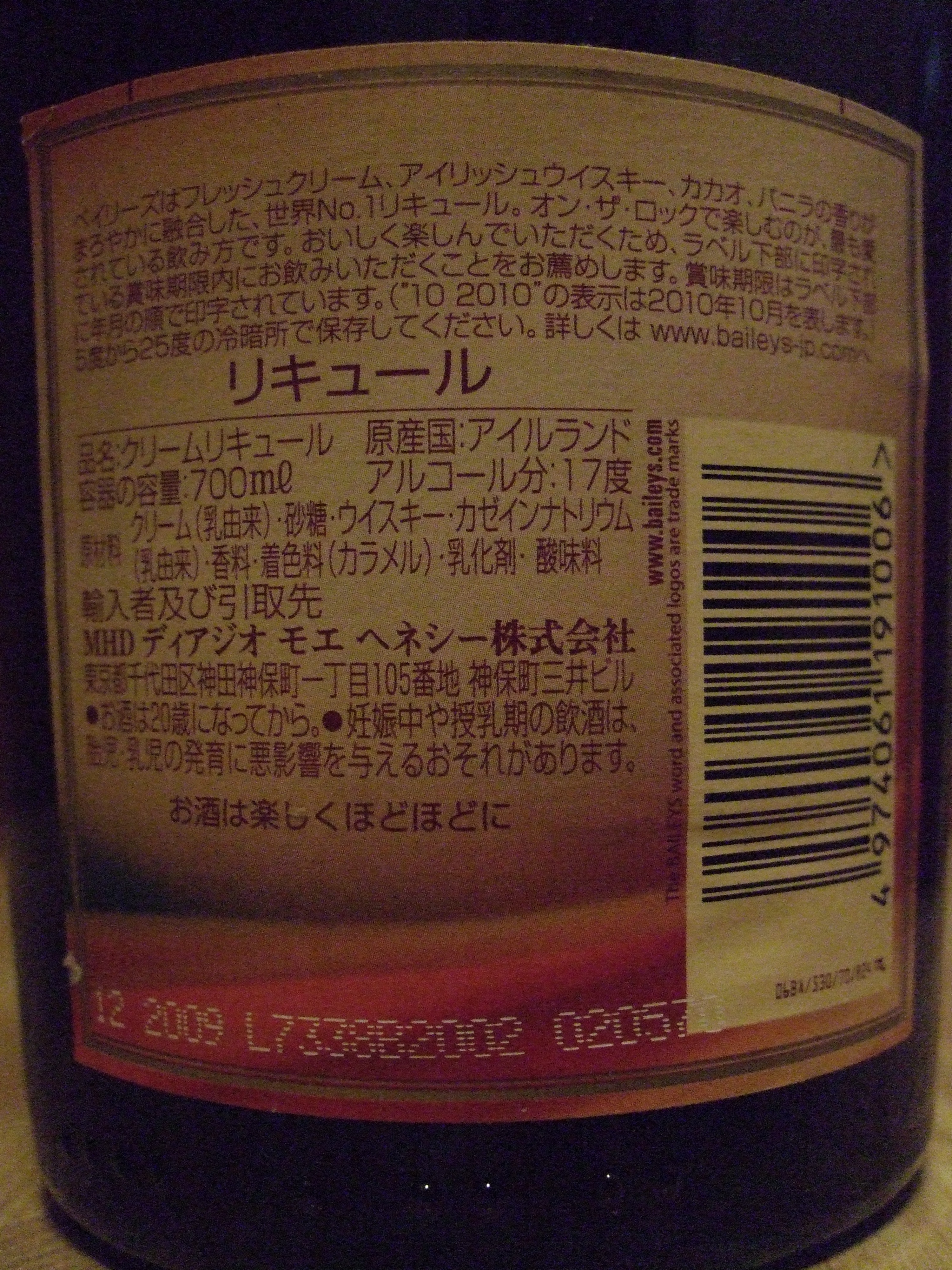 베일리스 제조에는 크림의 절반, 아이리시 위스키 10% 외에, 중성 알코올, 설탕, 기타 플레이버 (초콜릿, 바닐라 등)가 사용된다.