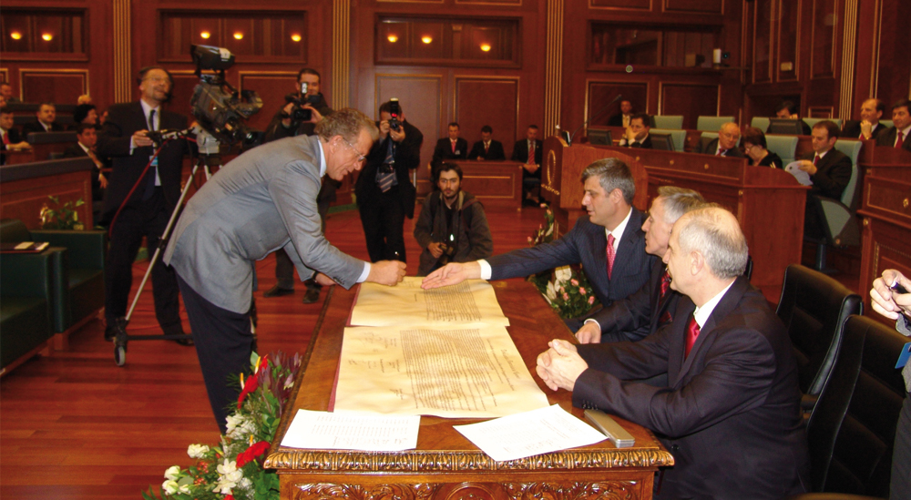 베흐제트 파촐리가 코소보 독립 선언문에 서명하고 있다