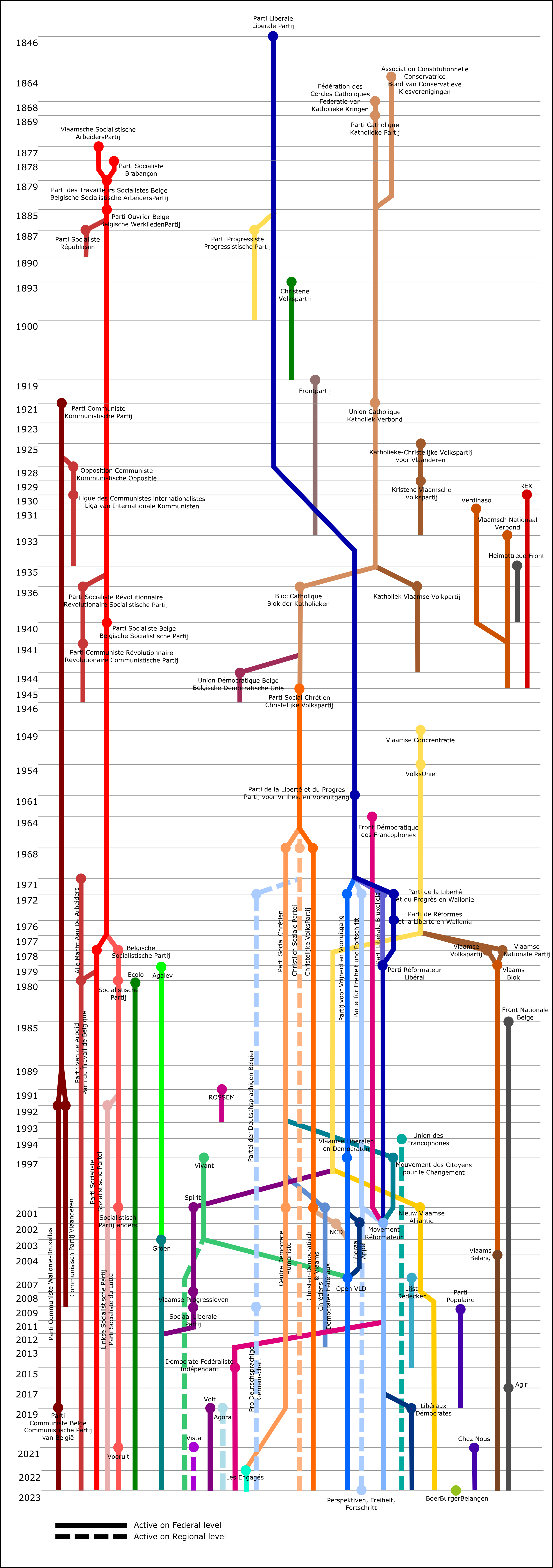 19세기 후반부터 제2차 세계 대전 이후까지 벨기에 정당의 대립축은 종교적 대립(기독교 VS 세속주의)과 계급 갈등(자본가 계급 VS 노동자 계급)을 중심으로 형성되었다.[10] 이에 따라 기독교 민주주의 정당 (가톨릭당), 자유주의 정당 (자유당 → 자유진보당), 사회주의 정당 (노동당 → 사회당)이 주요 정당으로 활동했다.[10]