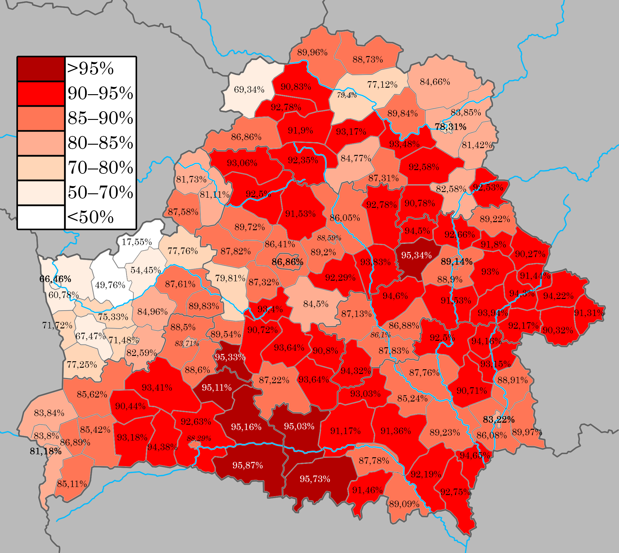 2009년 인구 조사에 따른 벨라루스 언어 (녹색 – 벨라루스어)