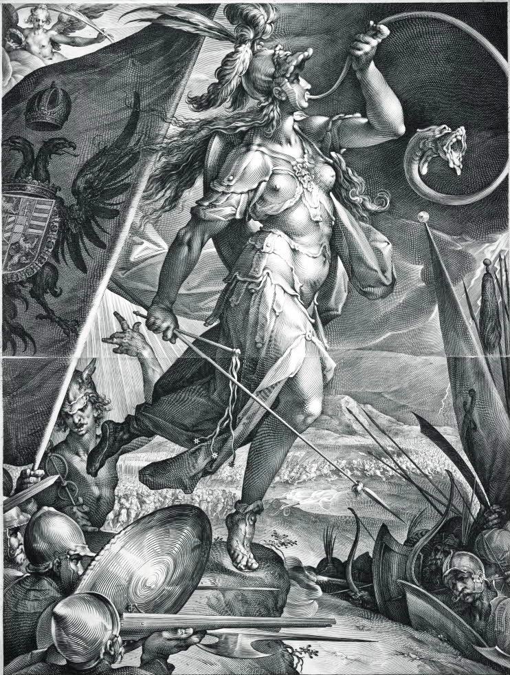 "튀르크에 맞선 제국군을 이끄는 벨로나", 1600년 바르톨로메우스 슈프랑거의 디자인을 바탕으로 한 판화