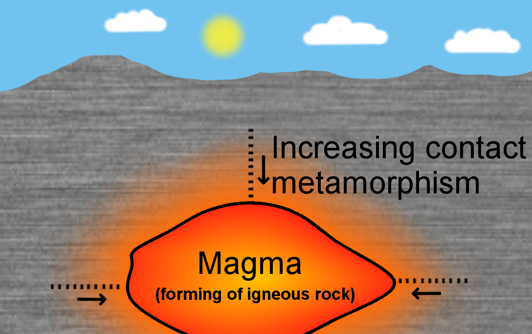 • 접촉 변성 작용: 마그마가 주변 암석에 관입하면서 발생하는 열에 의해 암석이 재결정되는 작용이다. 혼펠스가 주로 생성되며, 화성암체 주변에 변성 정도가 다른 동심원 형태의 분포(변성 오레올)가 나타난다.