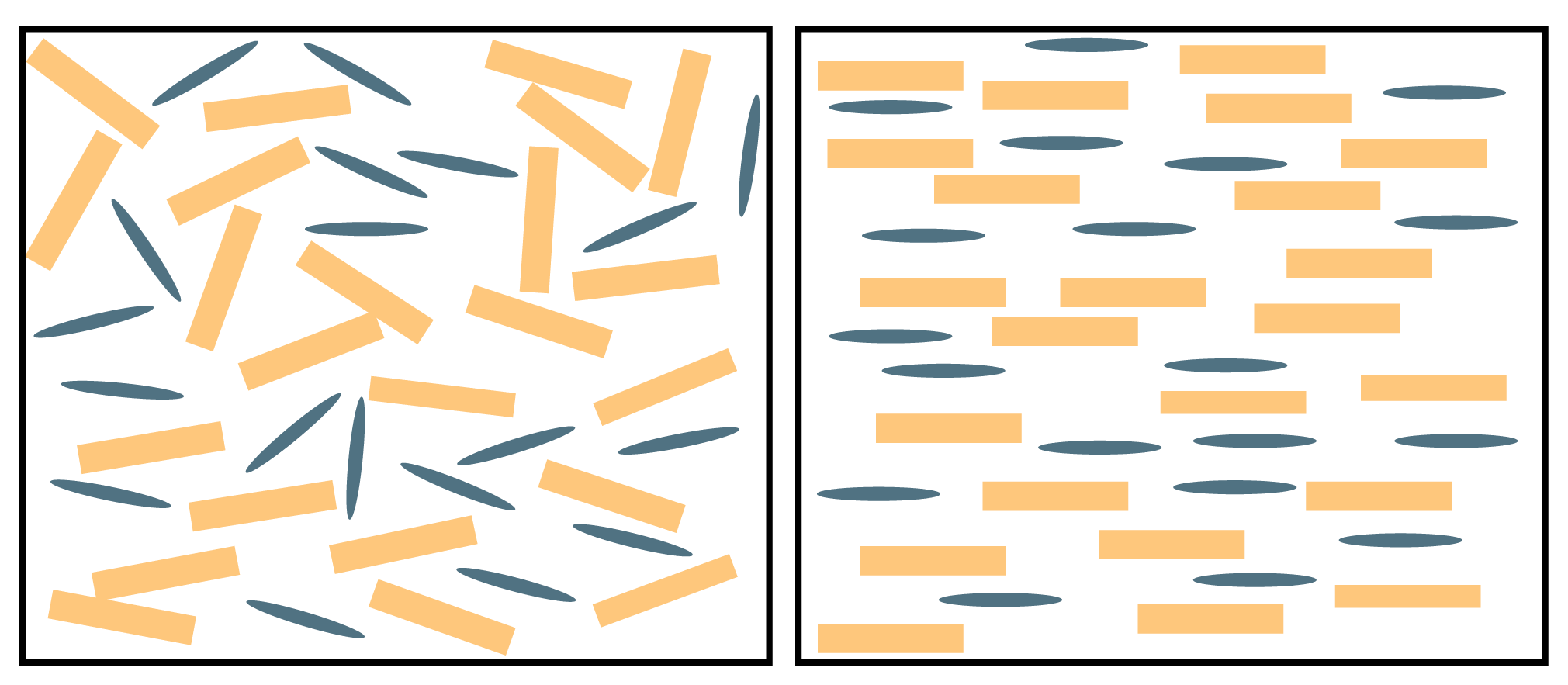 (왼쪽) 변성 작용 전 암석 내 입자의 무작위적인 배향. (오른쪽) 암석이 변성 작용 중 응력을 받으면 입자가 적용된 응력에 직교하게 정렬된다.