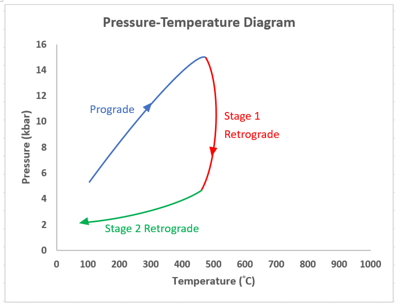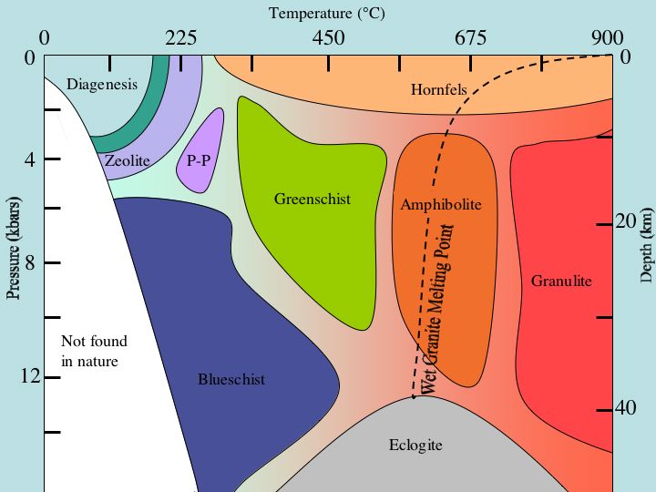온도-압력 그림. 변성 작용에서의 온도와 압력 변화의 예