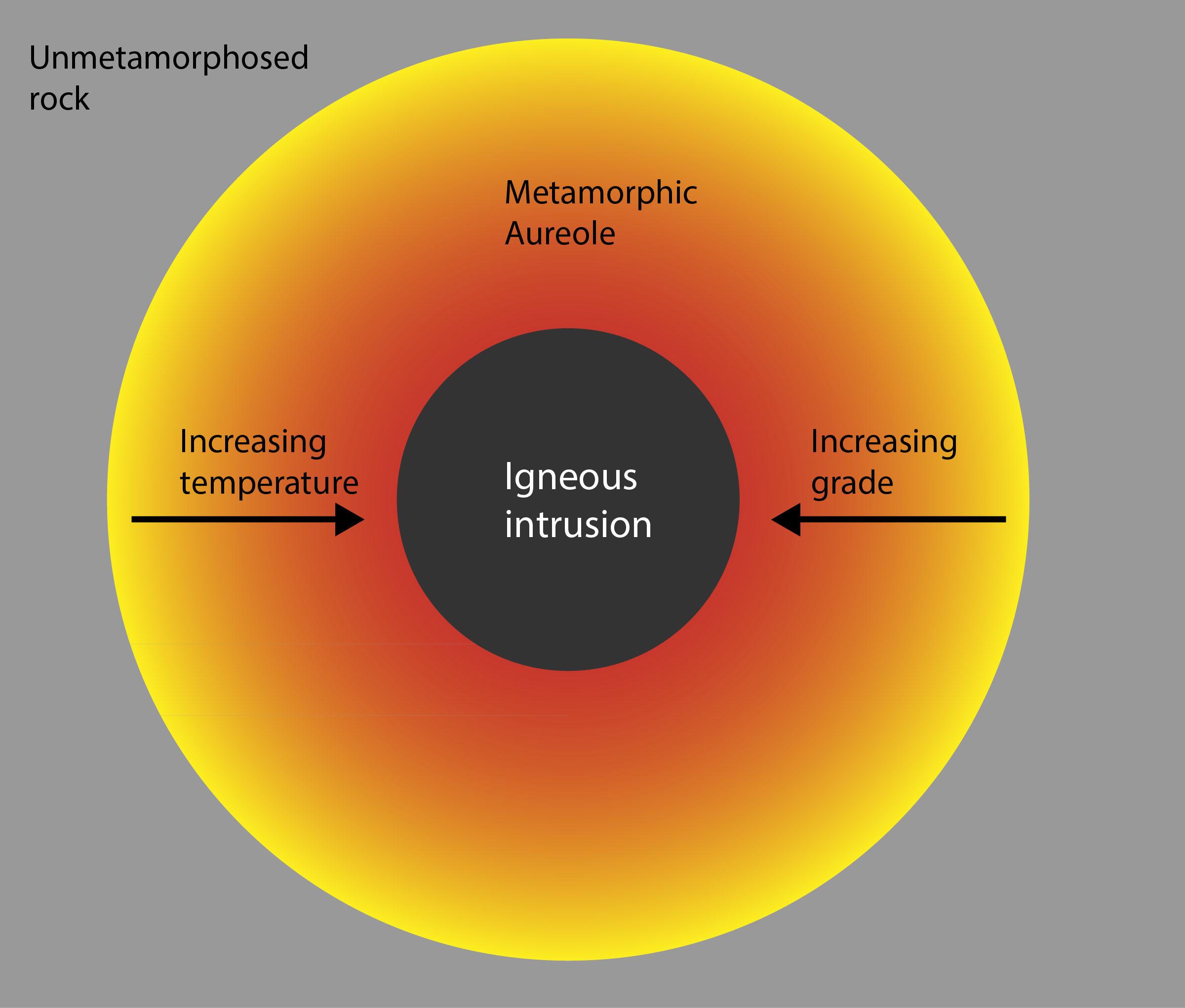 중앙의 화성암체에 가까워질수록 고온으로 변성 작용을 받는다.