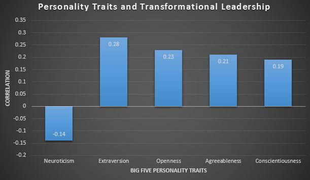 변혁적 리더십은 리더의 성격과도 관련이 있는데, 강점 배치 설문지(Strength Deployment Inventory)에 따르면 자기주장적-지시적 성격 유형은 변혁적 리더십과 중간 정도의 긍정적 상관관계를 보인다.[15] 변혁적 리더십과 관련된 주요 5가지 성격 특성은 외향성, 신경증, 경험에 대한 개방성, 쾌적함, 양심이다.[16] 이러한 특성들은 변혁적 리더십의 다양한 측면과 관련되어 리더십 발휘에 영향을 미친다.
