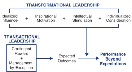 리더는 이상적인 영향력, 지적 자극, 개별적 배려를 통해 구성원을 변화시키고 동기를 부여한다. 또한, 현재 상황을 타개하고 성공적인 환경을 만들도록 새로운 방법을 제시하게 한다. 배스는 번스와 달리 변혁적 리더십과 거래적 리더십이 동시에 존재할 수 있다고 보았다.[8]