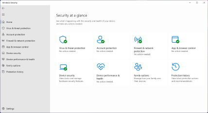 • 백신 및 방화벽 소프트웨어, 장치 드라이버, 장치 보안, 저장 용량, 계정 보호, 자녀 보호, SmartScreen 및 Windows Update를 모니터링한다.[14]