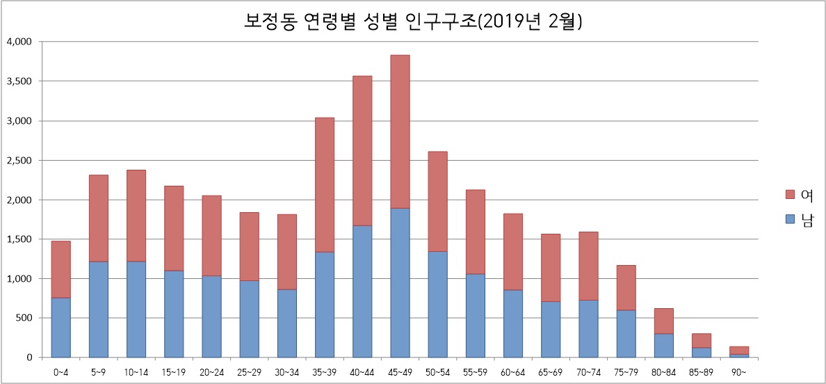 보정동의 인구는 2019년 2월 28일 기준 36,410명(내국인)으로 용인시 전체 인구의 3.5%를 차지한다. 남자는 17,824명, 여자는 18,586명이며 외국인은 209명이다.[1] 유소년(15세 미만 인구) 인구 비율은 16.9%로 용인시 전체 비율(16.1%)보다 높고, 노인(65세 이상 인구) 인구 비율은 14.8%로 용인시 전체 비율(12.2%)보다 높아 상대적으로 청장년 인구 비율이 낮다.[1]