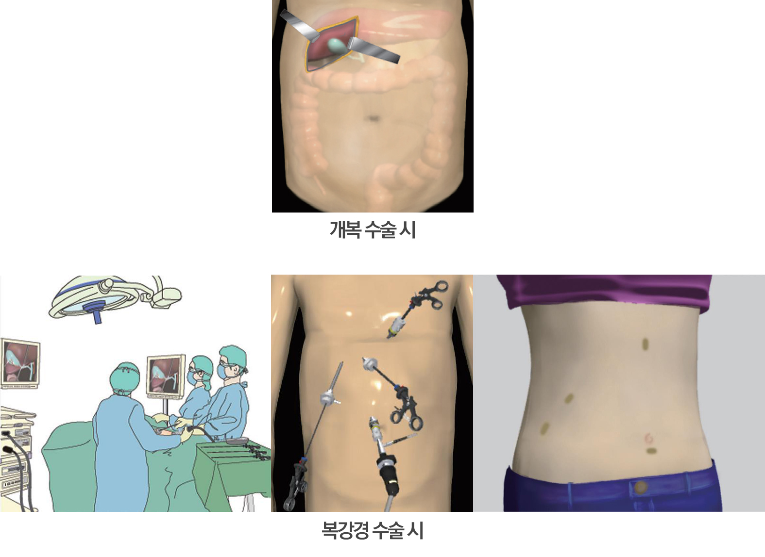 복강경 수술은 5~20cm 내외의 흉터를 남기는 개복 수술에 비해 보통 1곳 또는 3~4곳에 1cm 내외의 작은 구멍만 뚫으면 되기 때문에 흉터가 적고 수술 후 발생하는 통증도 적다.[2] 또한 개복 수술에 비해 균이 옮아 곪는 창상 감염과 같은 합병증의 위험이 덜하고, 빠른 회복 속도로 입원 기간이 짧아 일상생활로 빠르게 복귀할 수 있다는 장점이 있다. 국가가 건강보험을 운영하는 경우, 환자의 입원 기간이 짧아지면 국가의 재정 부담 또한 감소되는 효과가 있다.