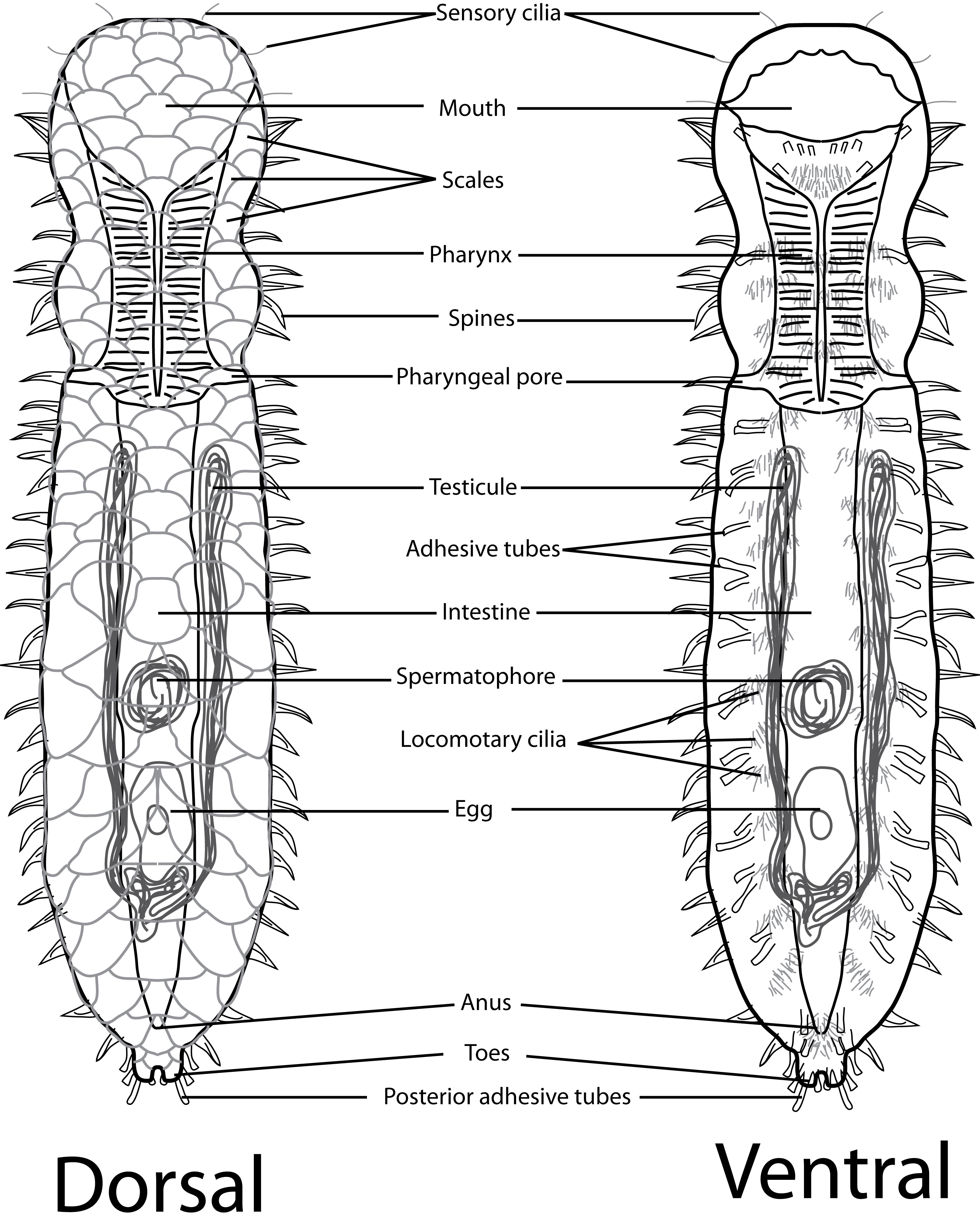 몸은 앞뒤로 가늘고 길며, 양측 대칭이고 배와 등의 구별이 있다. 특별한 부속지는 없으며, 몸 복면에 있는 섬모를 이용하여 움직인다. 또한, 복면의 점착선을 이용해 물체에 부착할 수 있다. 몸 표면은 큐티클로 덮여 있으며, 종에 따라 인편이나 가는 자침이 표면에 배열되어 있기도 하다.