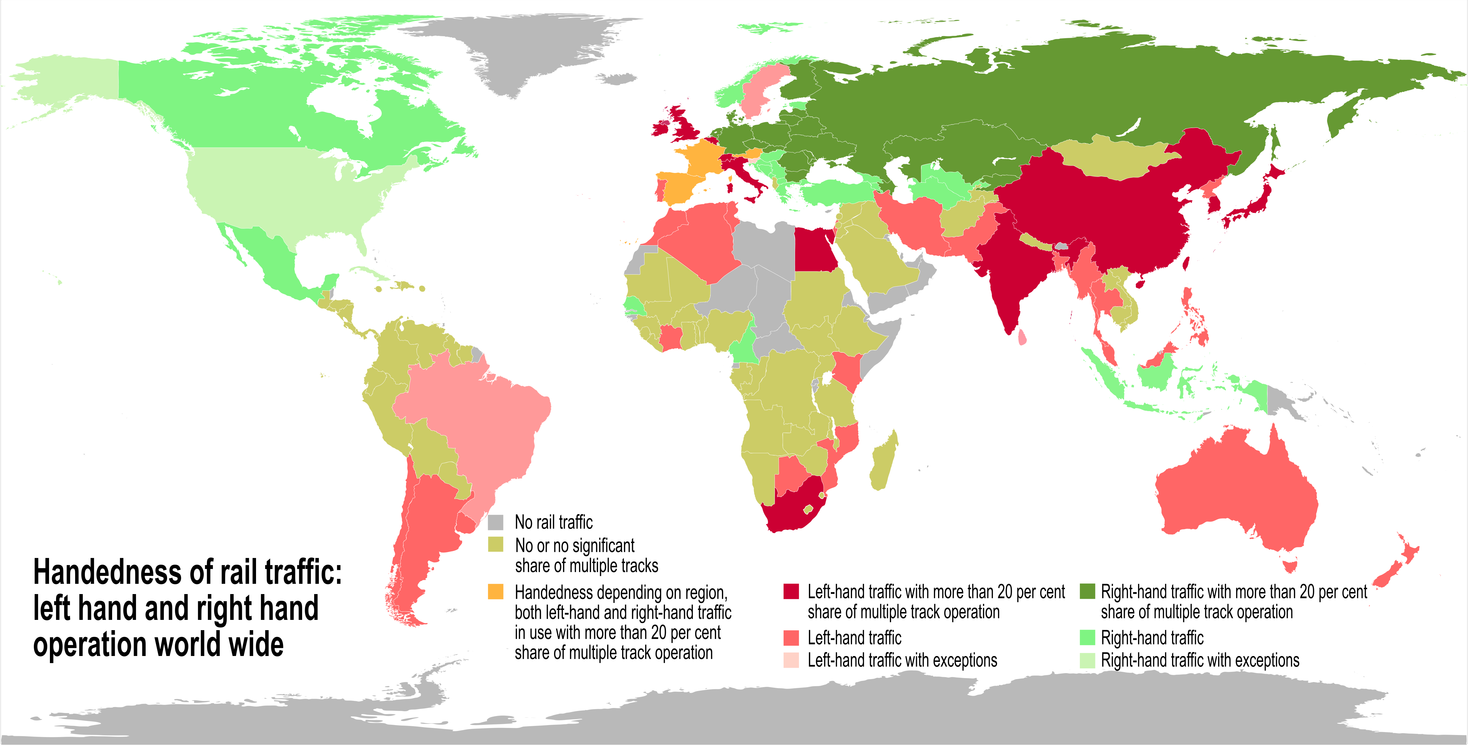 어떤 나라에서든 철도 교통은 일반적으로 이중 선로의 한쪽으로 운행되며, 항상 도로 교통과 같은 쪽은 아니다. 따라서 벨기에, 중국, 프랑스(옛 독일령 알자스와 로렌의 기존 노선 제외), 스웨덴(말뫼와 그 이남 지역 제외), 스위스, 이탈리아 및 포르투갈에서는 철도가 왼쪽 통행을 사용하는 반면 도로는 오른쪽 통행을 사용한다. 그러나 많은 예외가 있다.