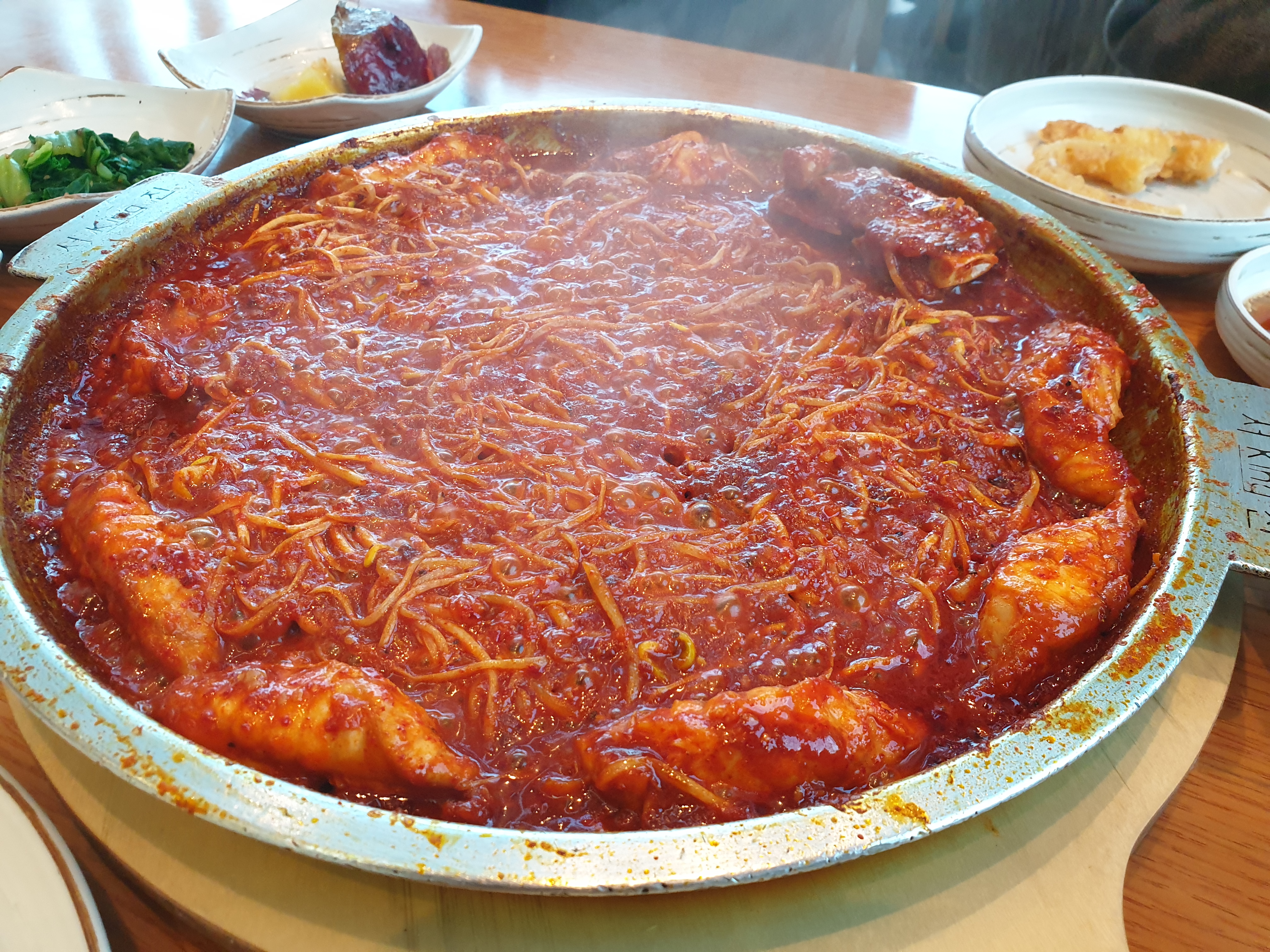 복어에 콩나물, 미나리 등을 넣고 매운 양념에 볶는 요리다. 다 먹고 난 후 남은 양념에 밥을 볶아 먹기도 한다.