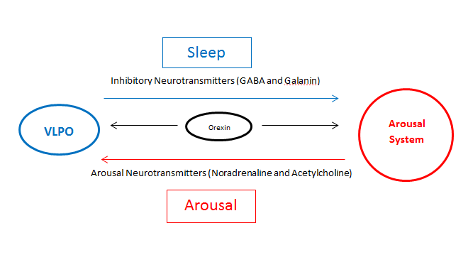 VLPO와 각성 시스템은 "플립플롭" 회로를 형성하여 상호 억제 작용을 통해 수면과 각성 상태를 빠르게 전환하고, 전환 상태에 머무는 시간을 최소화한다.[1][2] 후외측 시상하부의 오렉신 뉴런은 각성 시스템을 강화하고 뇌를 각성 상태로 안정시키는 데 도움을 준다. 오렉신 뉴런의 손실은 기면증에서 수면-각성 스위치를 불안정하게 만들어 수면-각성 조절에 문제를 일으킨다.[1]