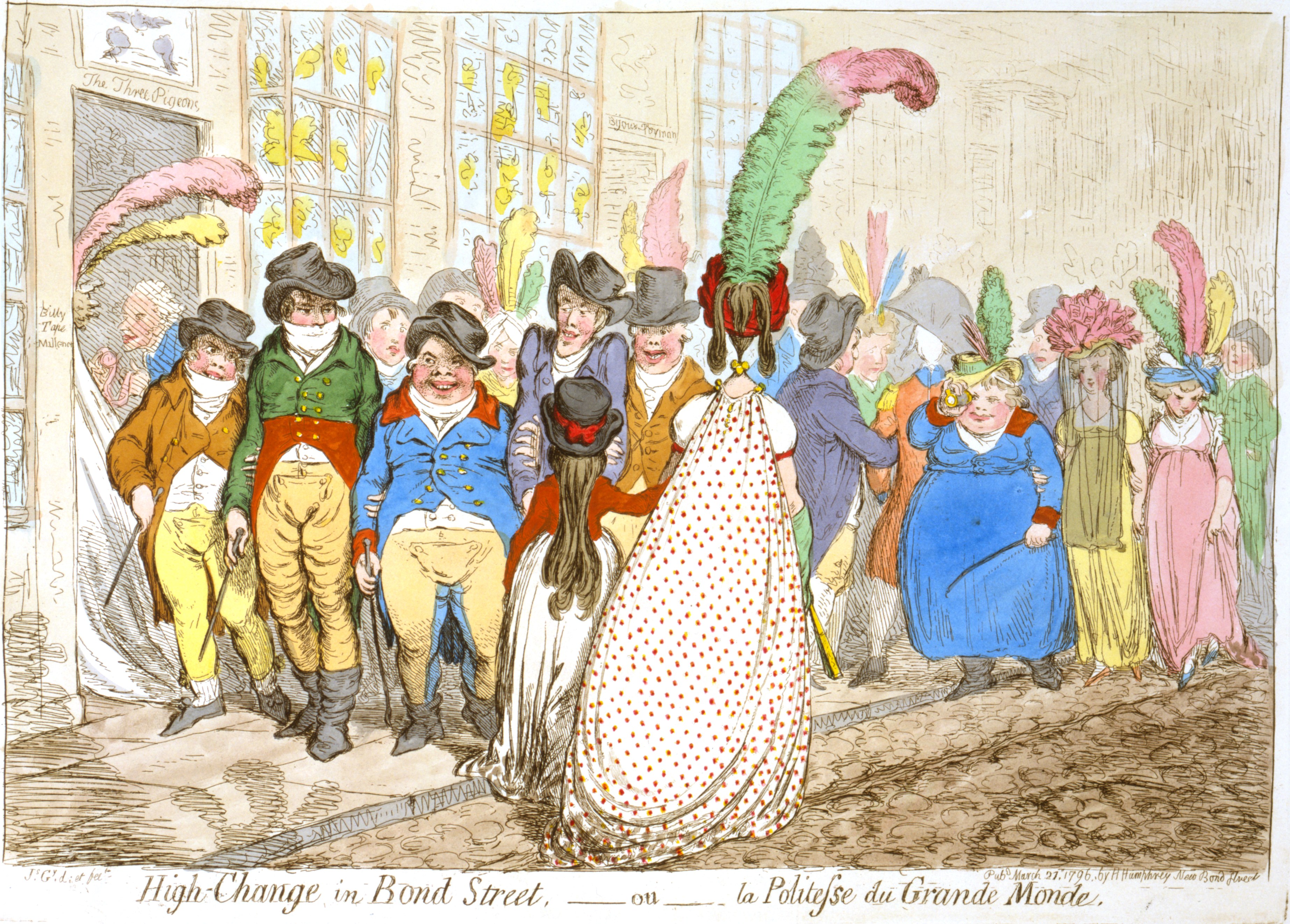 제임스 길레이는 1796년 작품 ''본드 스트리트의 하이 체인지(High-Change in Bond Street)''에서 당시 유행하던 멋진 환경인 본드 스트리트의 무례함(젊은이들이 보도를 다 차지하는 모습)을 풍자했다.