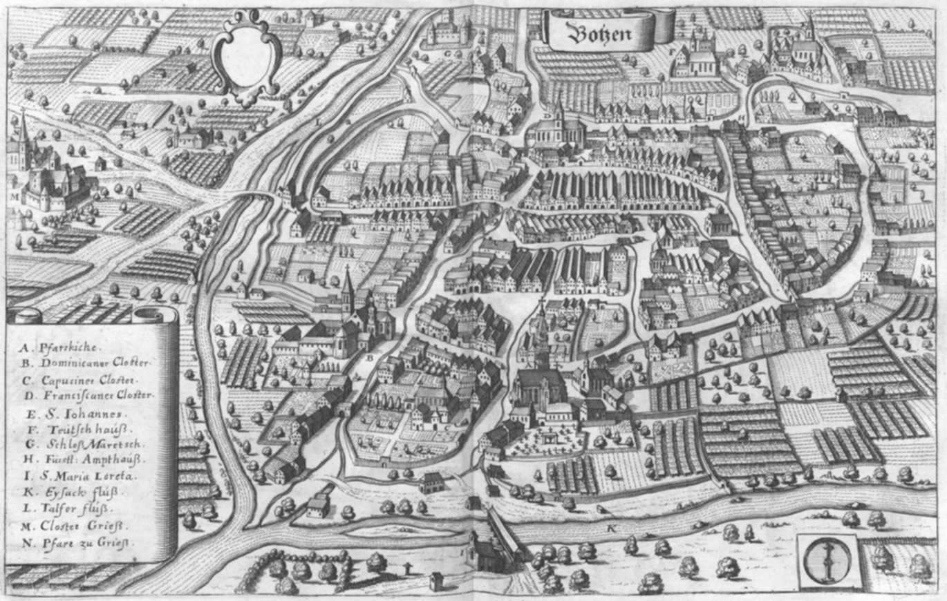 1027년, 신성 로마 제국의 콘라트 2세 황제(잘리어 왕조)는 볼차노 지역과 교구의 나머지 지역을 트렌토 주교후에게 하사하여 트렌토 주교령이 성립되었다. 12세기 말, 주교는 라우벤 거리를 따라 시장 도시를 건설했다. 이 도시는 해발 1371m의 브레너 고개를 넘어 아우크스부르크와 베네치아를 잇는 중요한 알프스 횡단 무역 거점으로 발전했으며, 신성 로마 제국의 일부였다.[19]