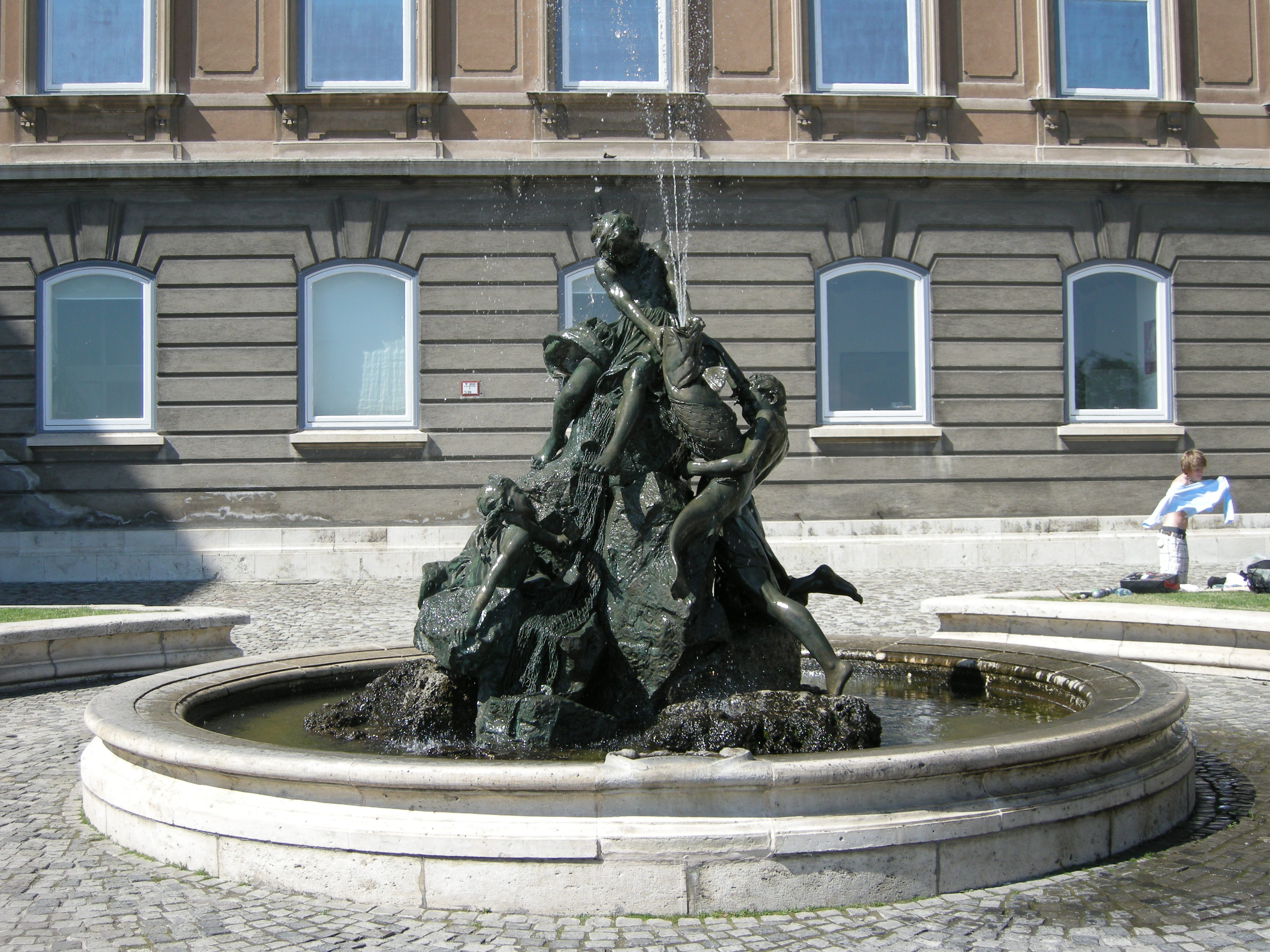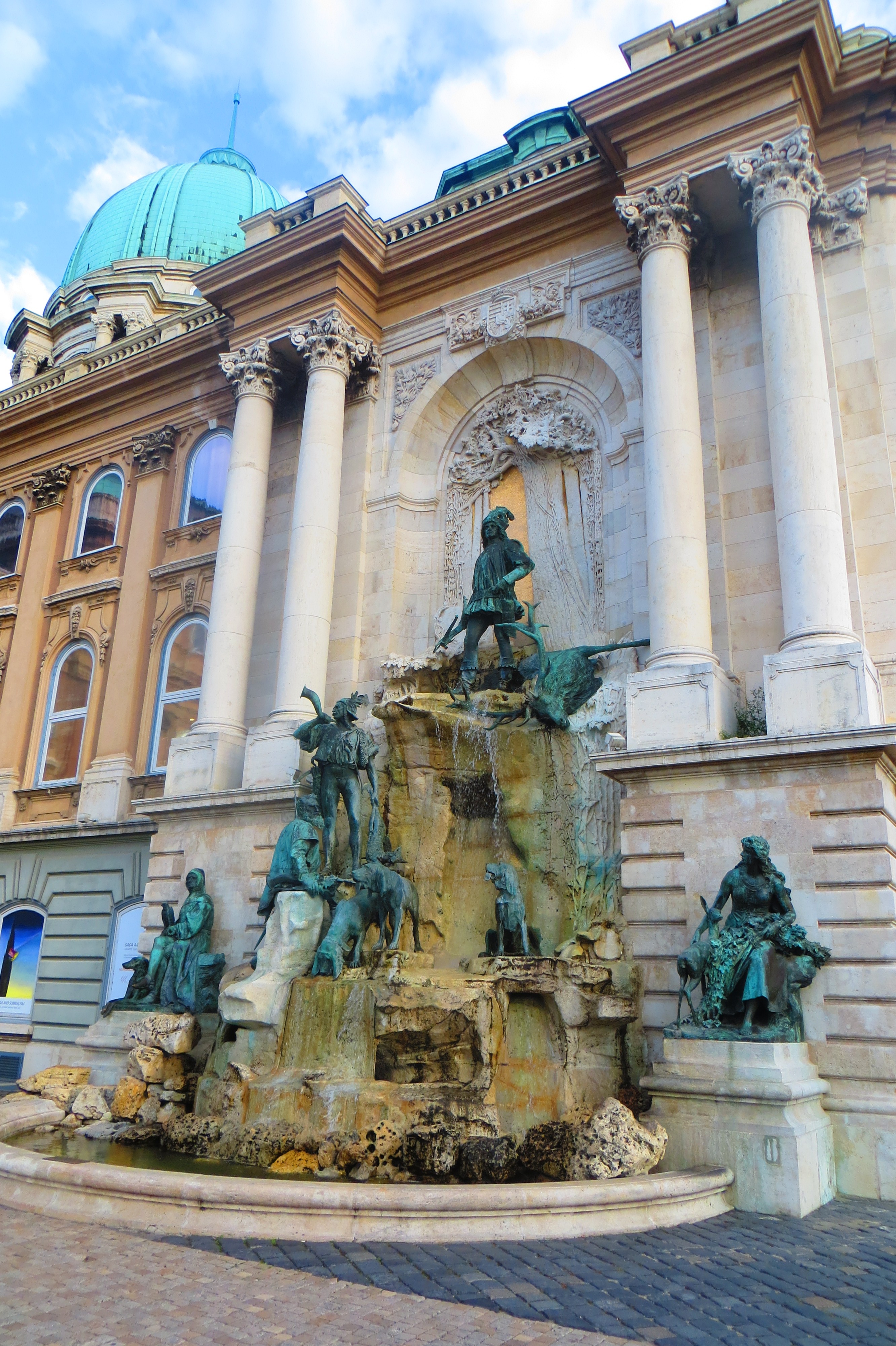 웅장한 분수는 궁전 서쪽 뜰을 장식하고 있다. 사냥개와 함께 마차시 코르비누스 왕이 이끄는 사냥꾼 그룹, 사슴 사체, 매를 든 마르티우스 갈레오티, 그리고 암사슴과 함께 있는 사랑스러운 일론카를 묘사한다. 이 사람들은 물이 분지로 흘러 들어가는 무너진 바위 사이에 서 있다. 이 분수는 조각가 알라요스 스트로블이 만들었다. 죽은 사슴은 1896년 스트로블이 소유한 숲에서 밀렵꾼에게 죽은 웅장한 수사슴을 본떠 만들었다. 손상된 조각상은 전쟁 후 복원되었다. 오늘날 궁전에서 가장 많이 사진이 찍히는 물건일 것이다.