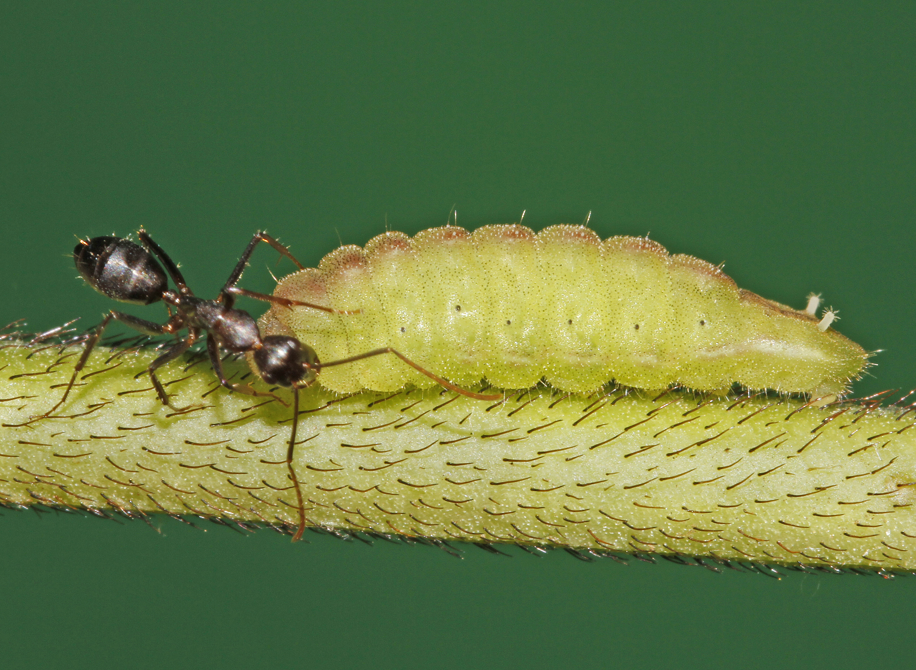 몇 가지 진화적 적응을 통해 이러한 연관성이 가능해졌는데, 여기에는 "공극 컵 돔 기관"이라고 불리는 애벌레 피부의 작은 분비선이 포함된다. 많은 종의 애벌레는 일곱 번째 복부 분절에 꿀을 생성하는 분비선이 있는데, 이를 "배쪽 밀선"(또는 "뉴코머 선")이라고 한다. "촉각 기관"이라고 불리는 가역 기관은 여덟 번째 복부 분절에 있으며, 이것은 원통형이고 스파이크 고리로 덮여 있으며 개미와의 소통에 도움이 되는 것으로 여겨지는 화학 신호를 방출한다.[6]