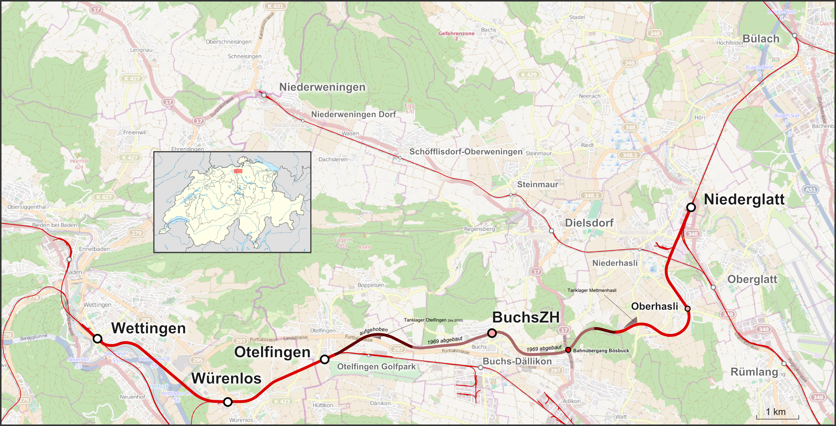 마을 상부에 있던 옛 역 건물은 남아 있었지만, 1969년에 대부분의 선로가 철거되었다. 뷜라흐-바덴 선의 일부 선로는 오텔핑겐과 역 사이, 그리고 와 오버하슬리 남쪽의 산업 지역 사이에 남아 있다. 선로는 인접한 산업 시설에서 사용된다.[8]