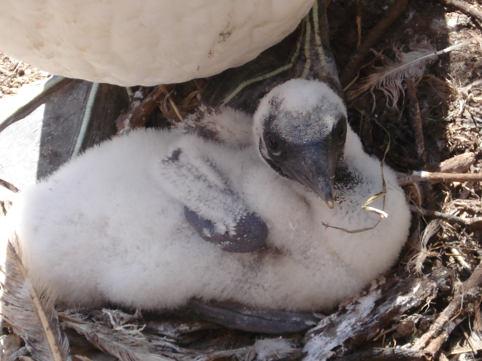 갓 부화한 새끼는 깃털이 없고 짙은 파란색 또는 검은색이다. 생후 2주차에는 흰색 솜털로 덮이고, 다음 5주 동안 흰색 반점이 있는 짙은 갈색 깃털로 대체된다. 어린 새끼는 부모가 반쯤 소화된 물고기를 토해서 먹인다. 성체는 새끼가 둥지를 떠날 때까지 약 13주 동안 먹이를 준다. 어린 새는 84~97일 사이에 이소하며, 절벽에서 몸을 던져 날아간다.