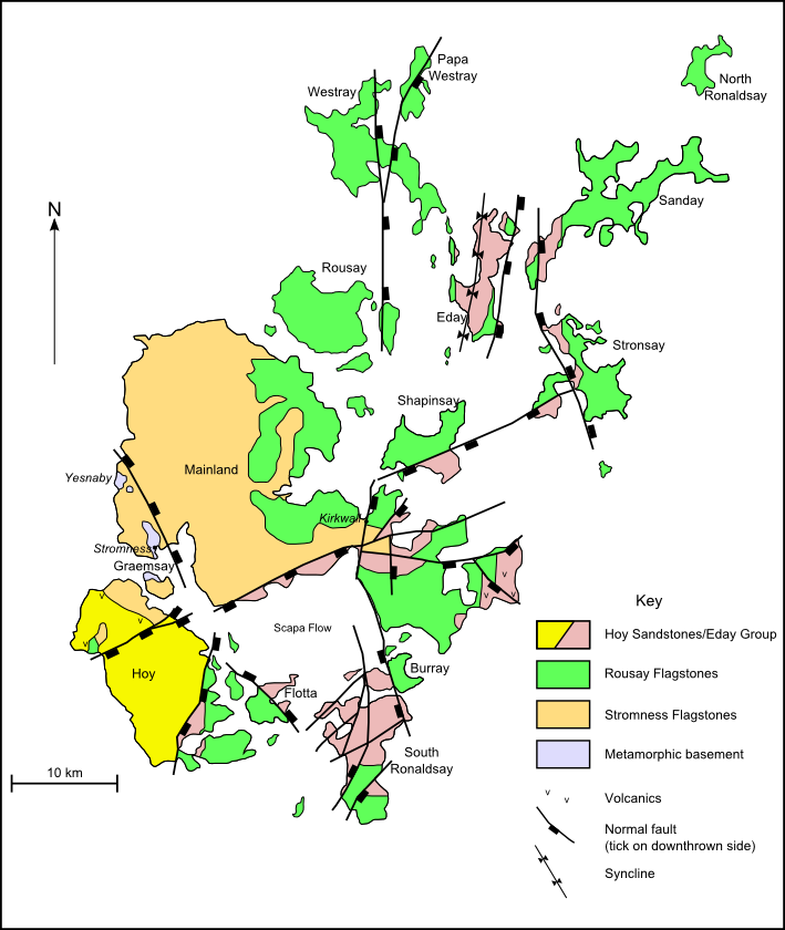 오크니 제도의 지표암은 거의 대부분 고적색 사암이며, 이 암석은 데본기 중기에 형성되었다.[11][176] 이 사암은 변성암인 모인 슈퍼그룹 위에 놓여 있는데, 스트롬네스와 잉가네스 사이, 그리고 그렘세이섬에서 그 띠 모양의 노두를 볼 수 있다.[12][177]중기 데본기 현무암 화산암은 서부 호이, 동부 본토의 디어네스 및 샤핀세이에서 발견된다. 호이 화산암과 다른 두 노출 지점 간의 상관관계는 화학적 구성의 차이로 인해 불확실하다.[13][178] 후기 페름기의 람프로파이어 암맥이 오크니 전역에서 발견된다.[14][179] 빙하 줄무늬와 백악 및 부싯돌 빙하 퇴적암의 존재는 북해의 바닥에서 유래하여 섬들의 지형에 얼음 작용의 영향을 받았음을 보여준다.[15][180] 역암 점토도 풍부하며, 퇴석이 상당한 지역을 덮고 있다.[180]