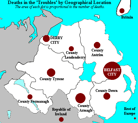 분쟁 지역 | 북아일랜드 (주요) 아일랜드 공화국 잉글랜드 유럽 대륙 본토 (간헐적 폭력 확산) |