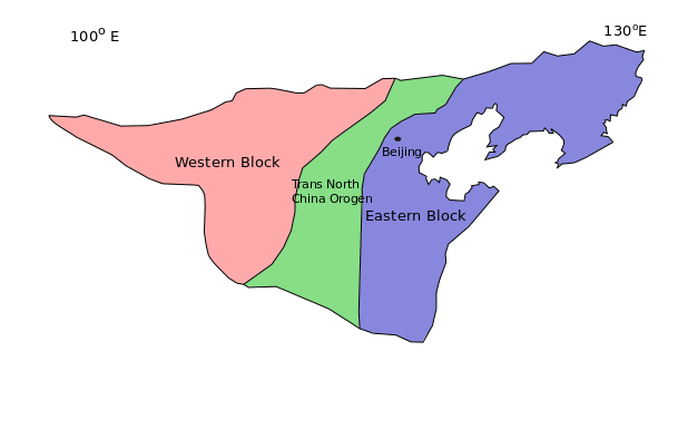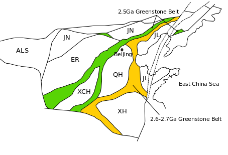 - 중앙 조산대 경계는 랴오닝성 서부에서 허난성 서부까지 약 1,600km 길이의 시생누대 지층이다.[75]